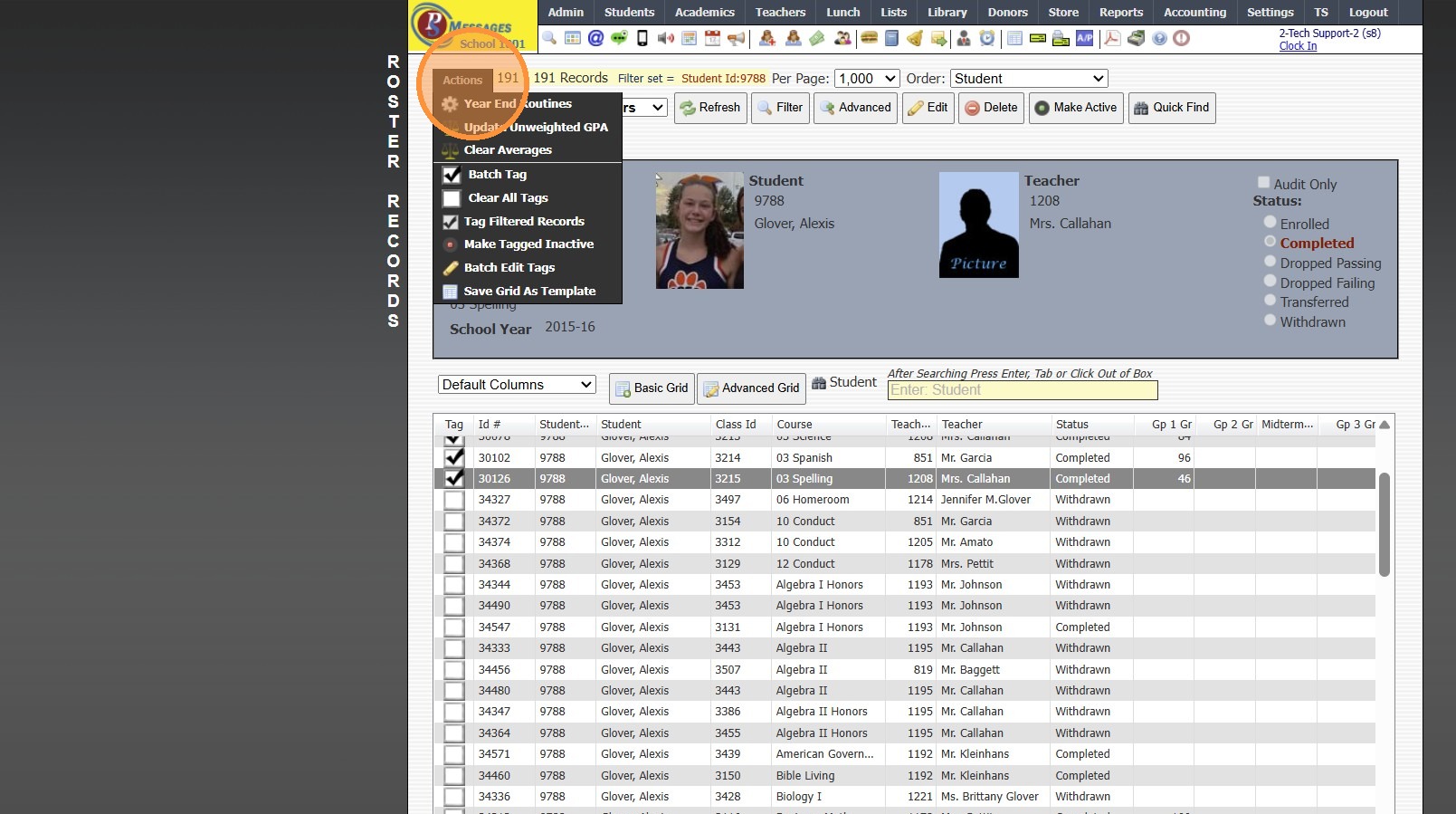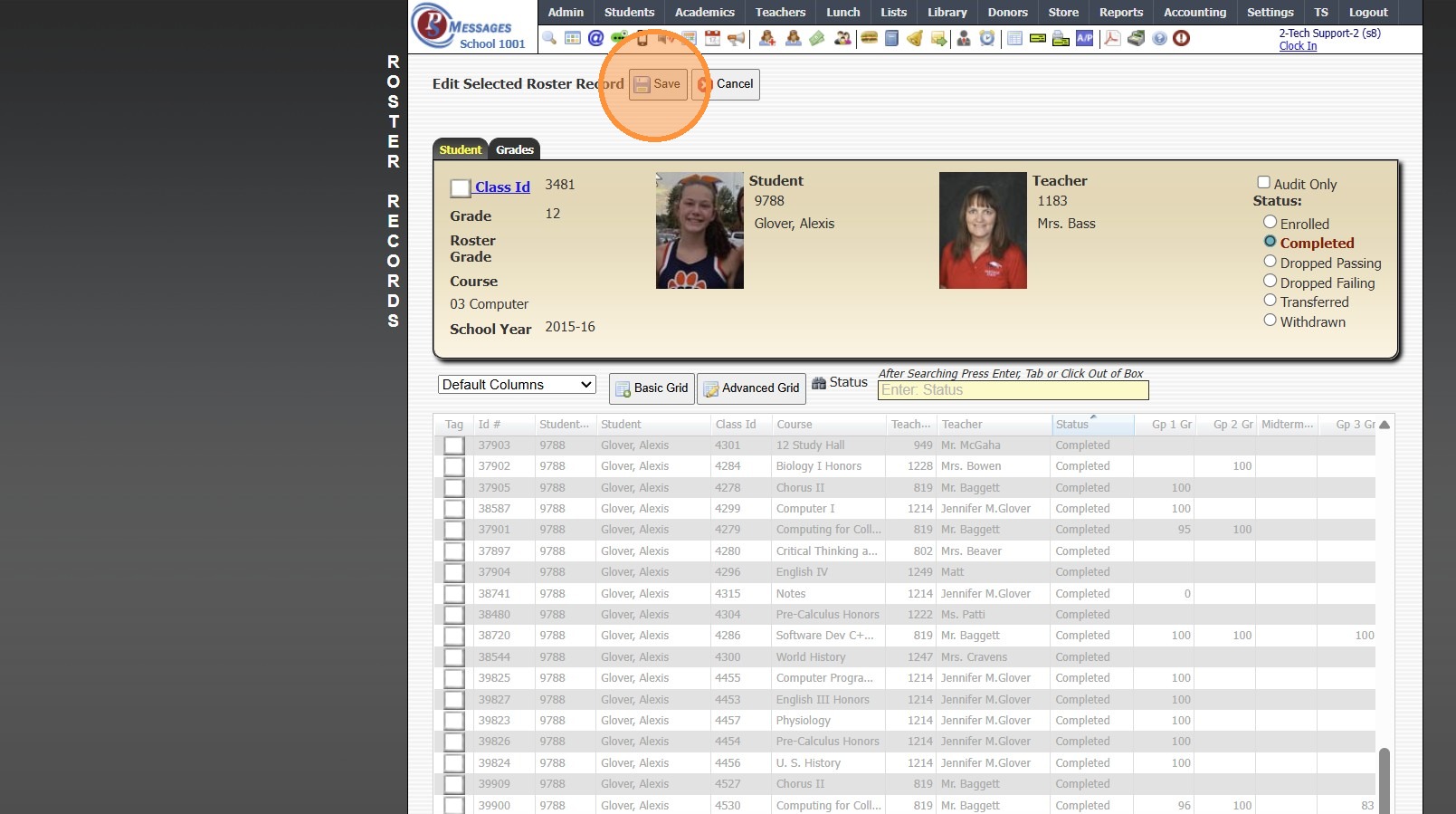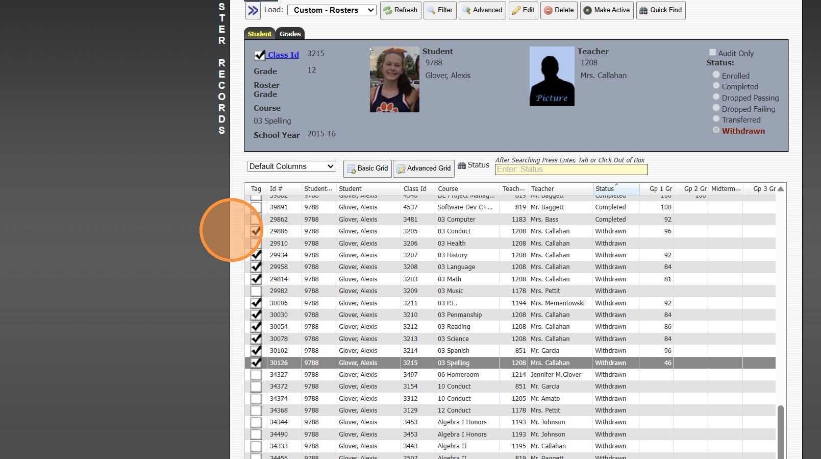 Tip: When Withdrawing the Student, next to Clear Class Schedule, the default option of Completed was more than likely changed to Withdrawn. Follow Instructions below to mark Class Rosters to Completed.