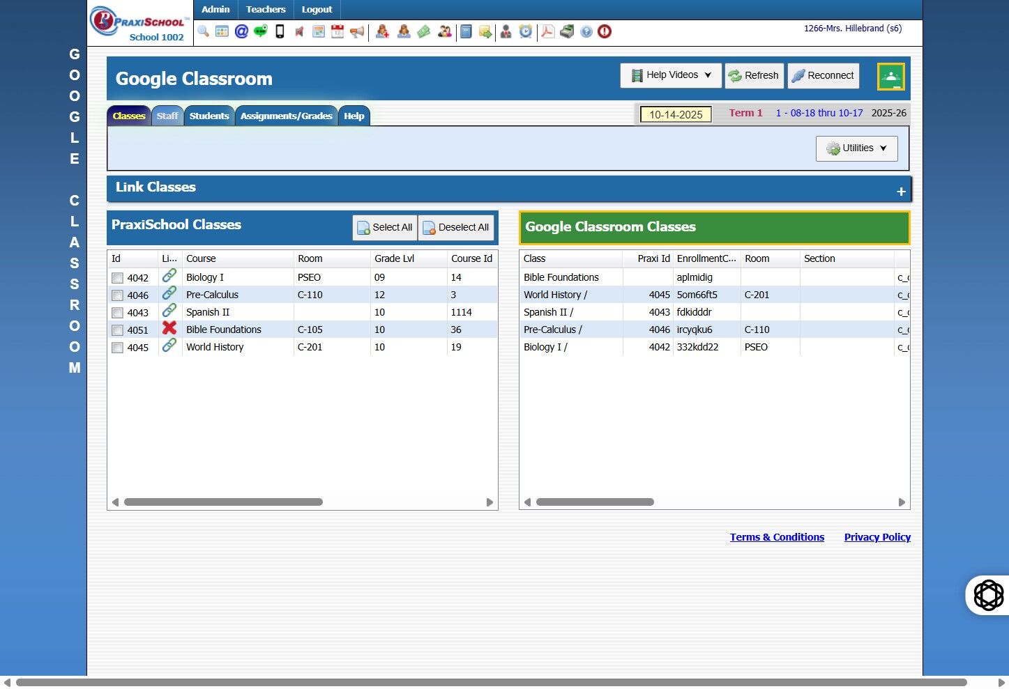Unlinking PraxiSchool Class with Google Classroom 1. Click "Teachers" 2. Click "Google Classroom" 3. Check Praxi class to unlink. 4. Click "Utilities" 5. Click "Clear Selected Links" 2500.2.5