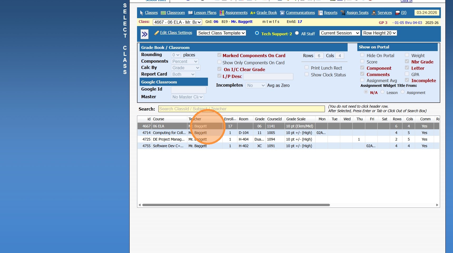 Issuing a PACE in the Learning Center 1. Click "Teachers" 2. Click "Classroom" 3. Select Learning Center Course in Grid 4. Click "Grade Book" 5. Select Student 6. Click on the Line "-" Under the PACE Number to Issue 7. Click "Issue" 2500.17.3