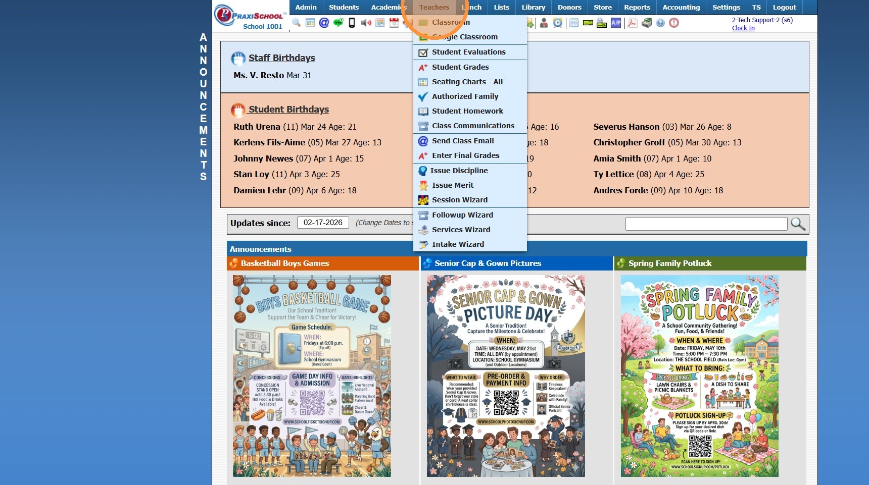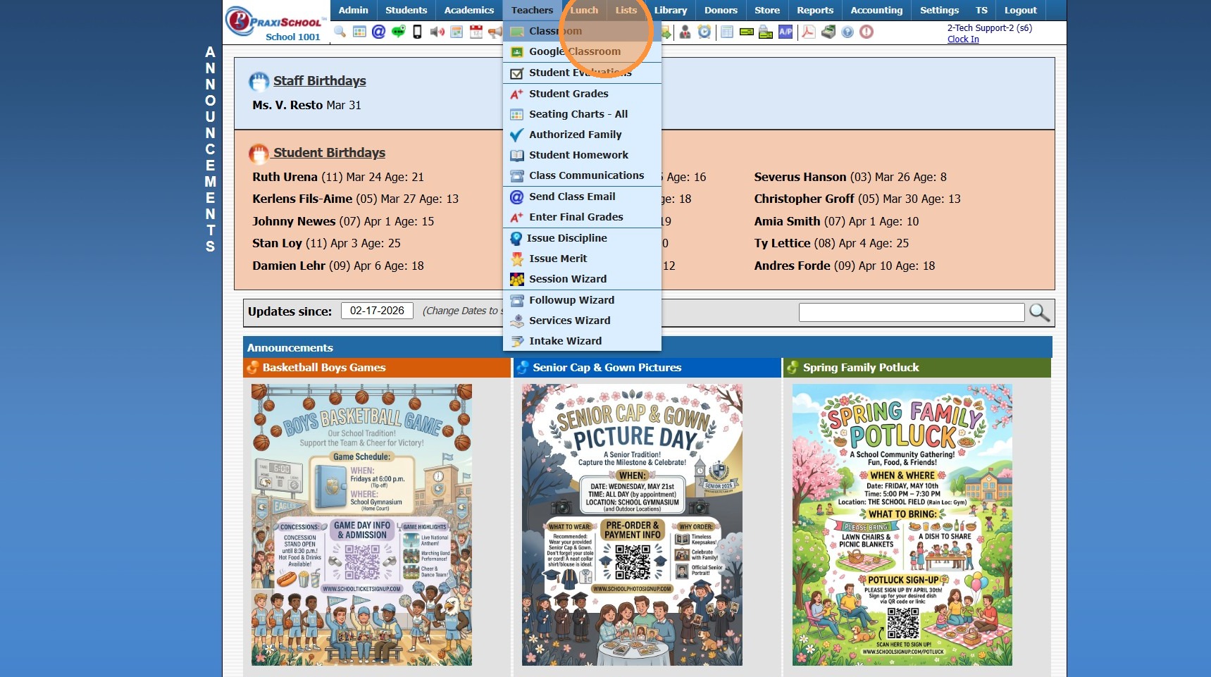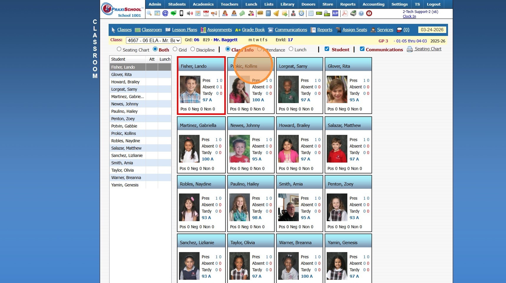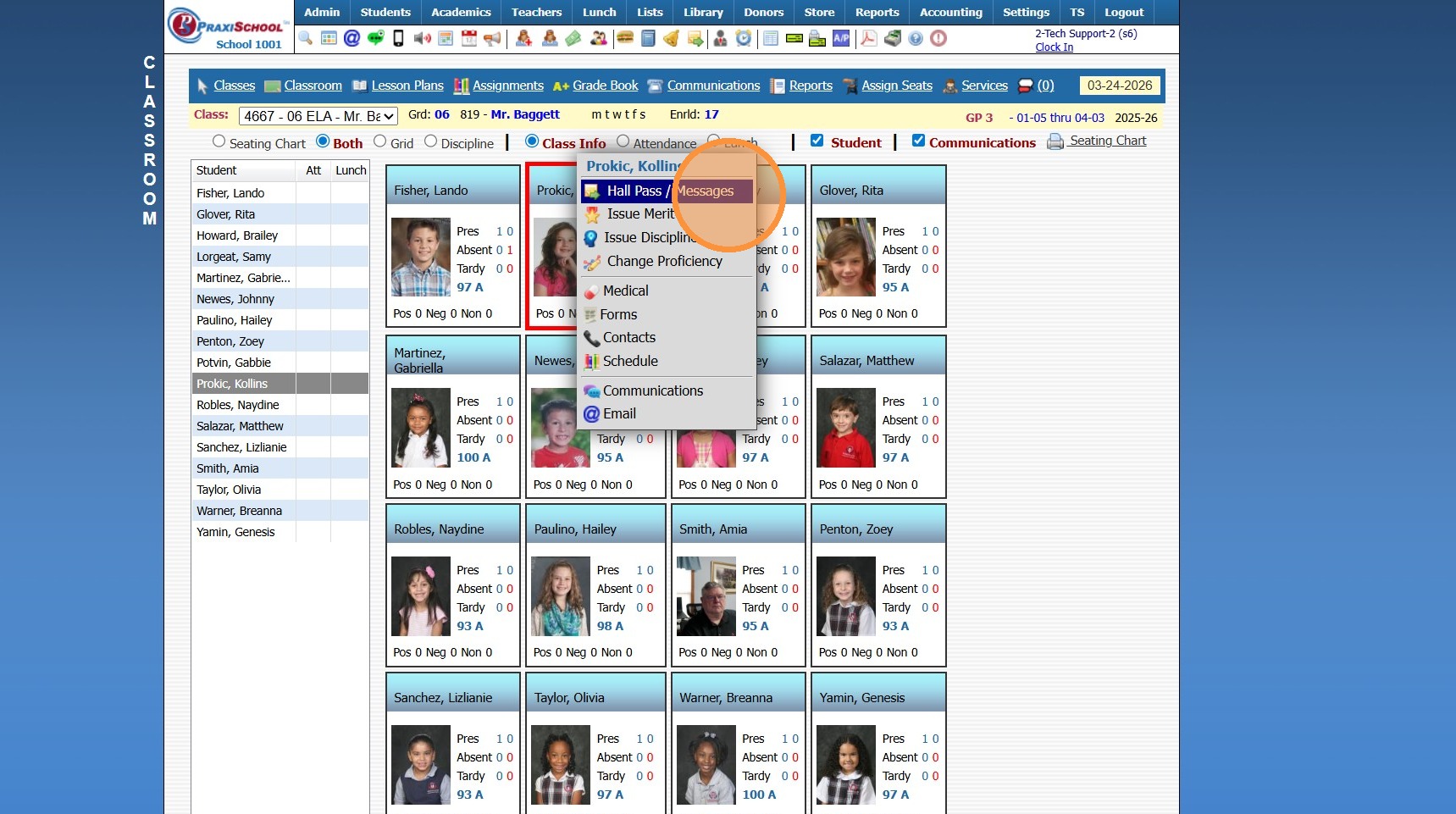 Issuing Discipline from the Classroom 1. Login to PraxiSchool 2. Click "Teachers" 3. Click "Classroom" 4. Click "Classroom" 5. Click the "Class Info" field. 6. Left Click the Student Profile 7. Click "Issue Discipline" 8. Select the Reason 9. Under ...