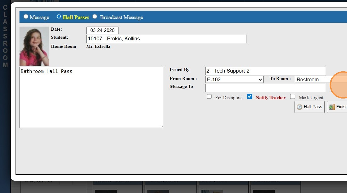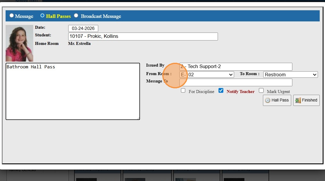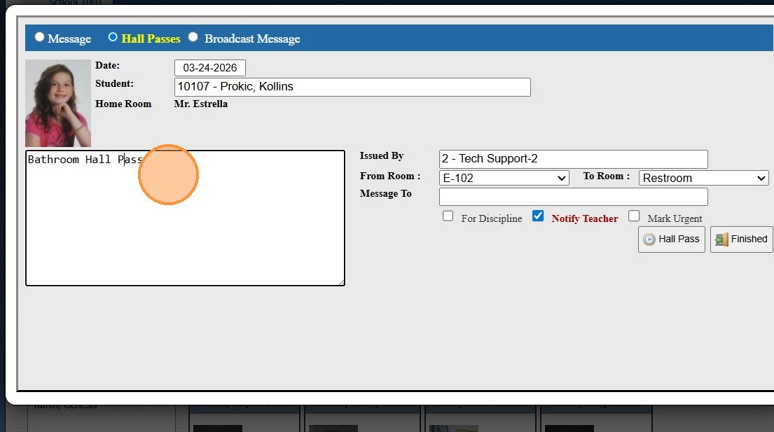 Issuing a Hall Pass (Icon) 1. Click Hall Pass / Message Icon 2. Select Student 3. Select Room From and Room To (Optional) 4. Select Staff to Receive Message 5. Select Message Options: For Discipline - Hall Pass Issued for Student as a Result of a ...