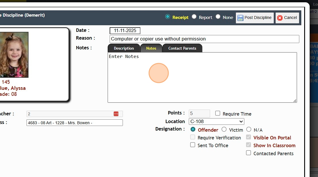 Typically used to issue a Discipline for a Student not in a Teachers class.