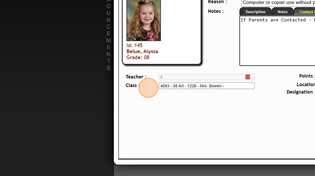 Issuing Discipline from the Classroom 1. Login to PraxiSchool 2. Click "Teachers" 3. Click "Classroom" 4. Click "Classroom" 5. Click the "Class Info" field. 6. Left Click the Student Profile 7. Click "Issue Discipline" 8. Select the Reason 9. Under ...