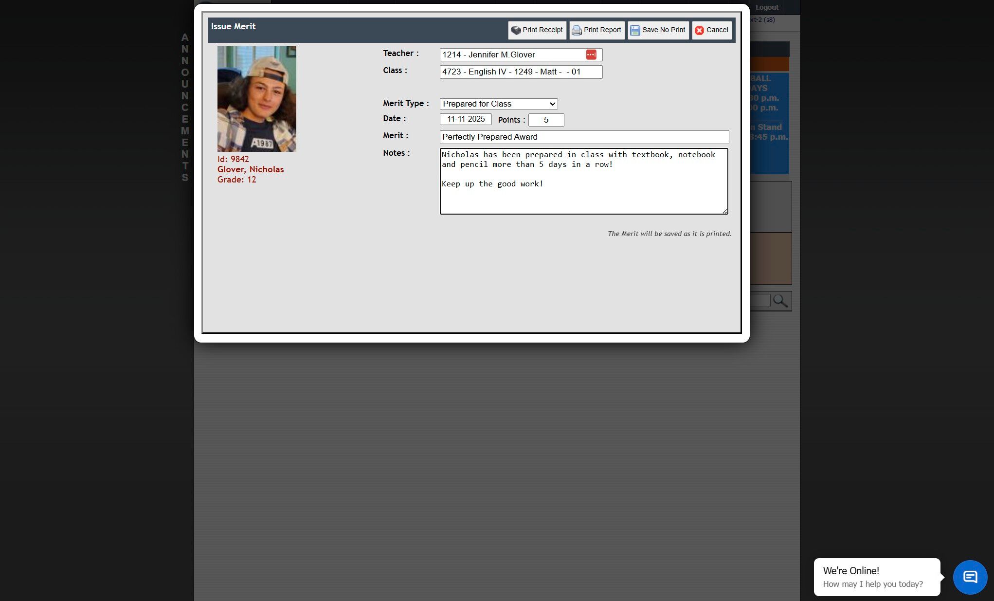 Issuing a Student Merit from Teachers