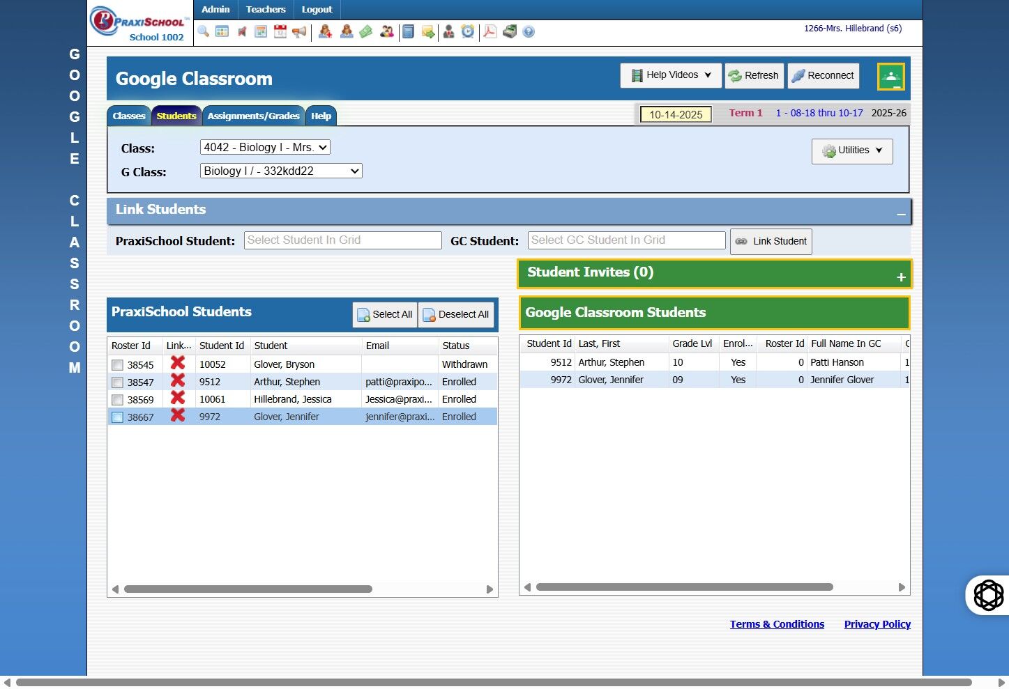 Unlinking Student in PraxiSchool Class with Google Classroom Student 1. Click "Teachers" 2. Click "Google Classroom" 3. Click "Students" 4. Select the "4042 - Biology I - Mrs. Hillebrand" option. 5. Check student you want to unlink. These must be ...