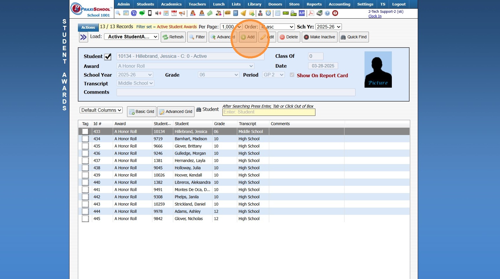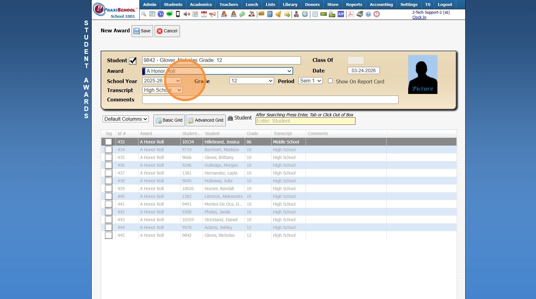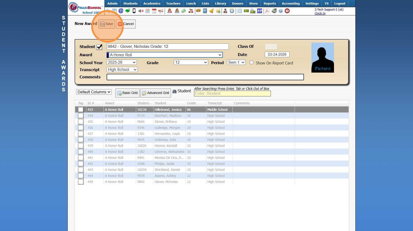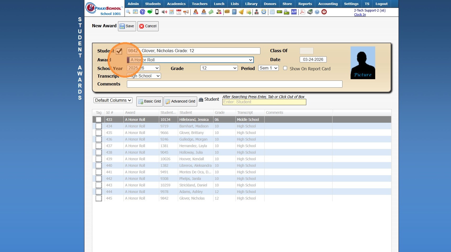 (Student Awards can be added to the Student Report Card by Checking the Box for Show on Report Card)