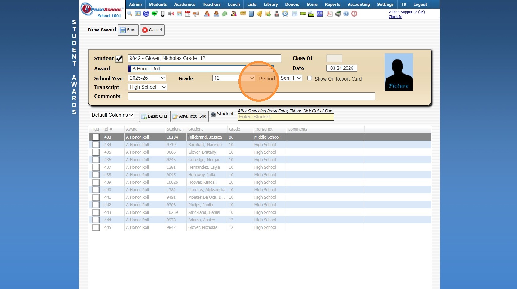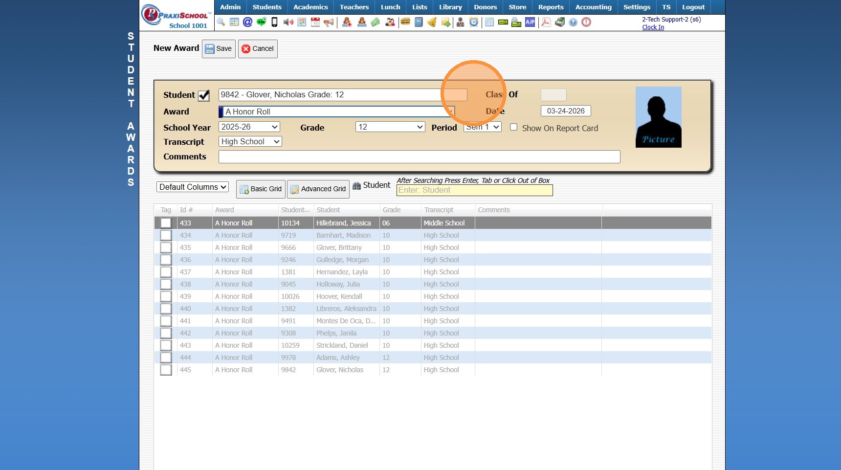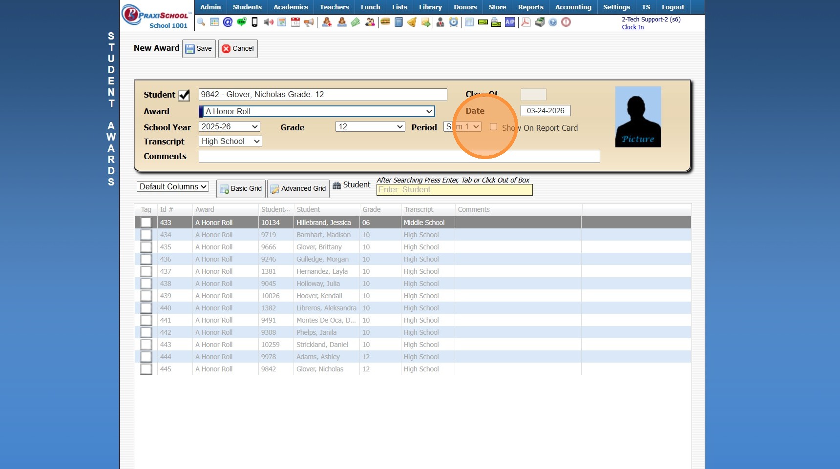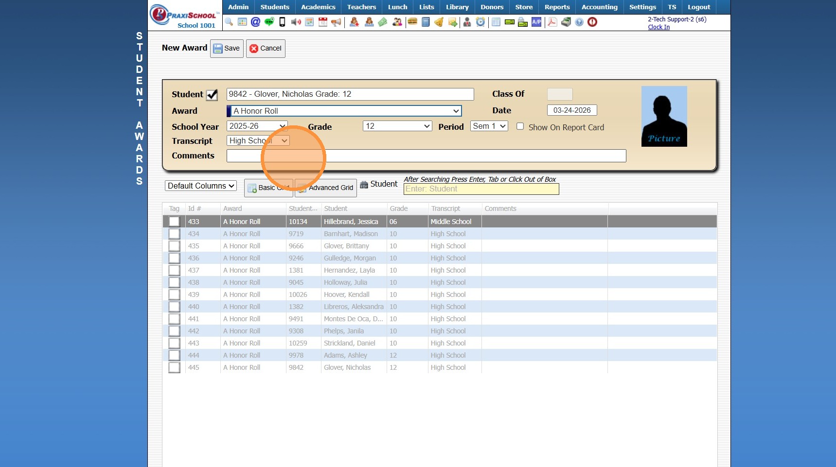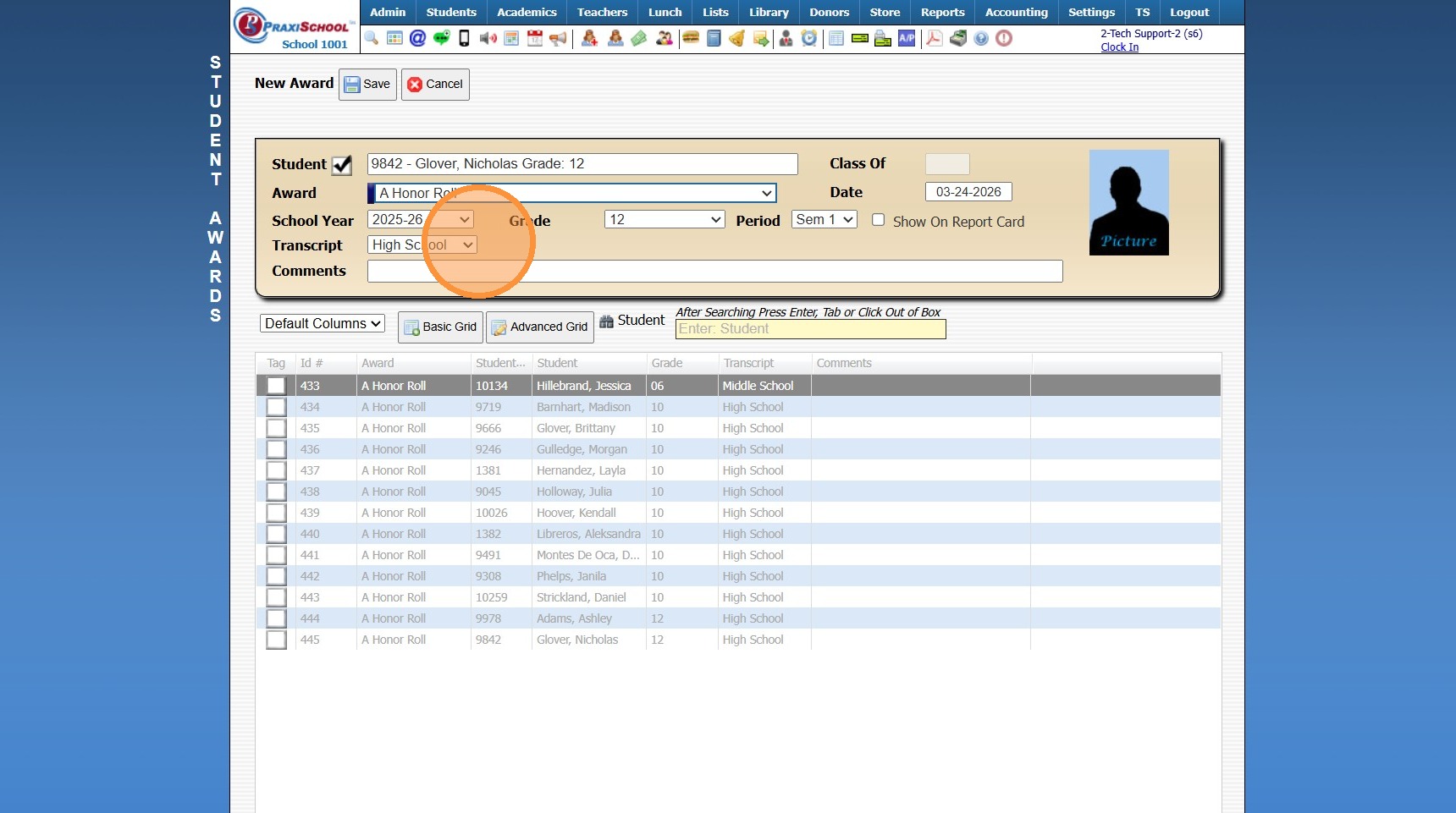 (Student Awards can be added to the Student Report Card by Checking the Box for Show on Report Card)