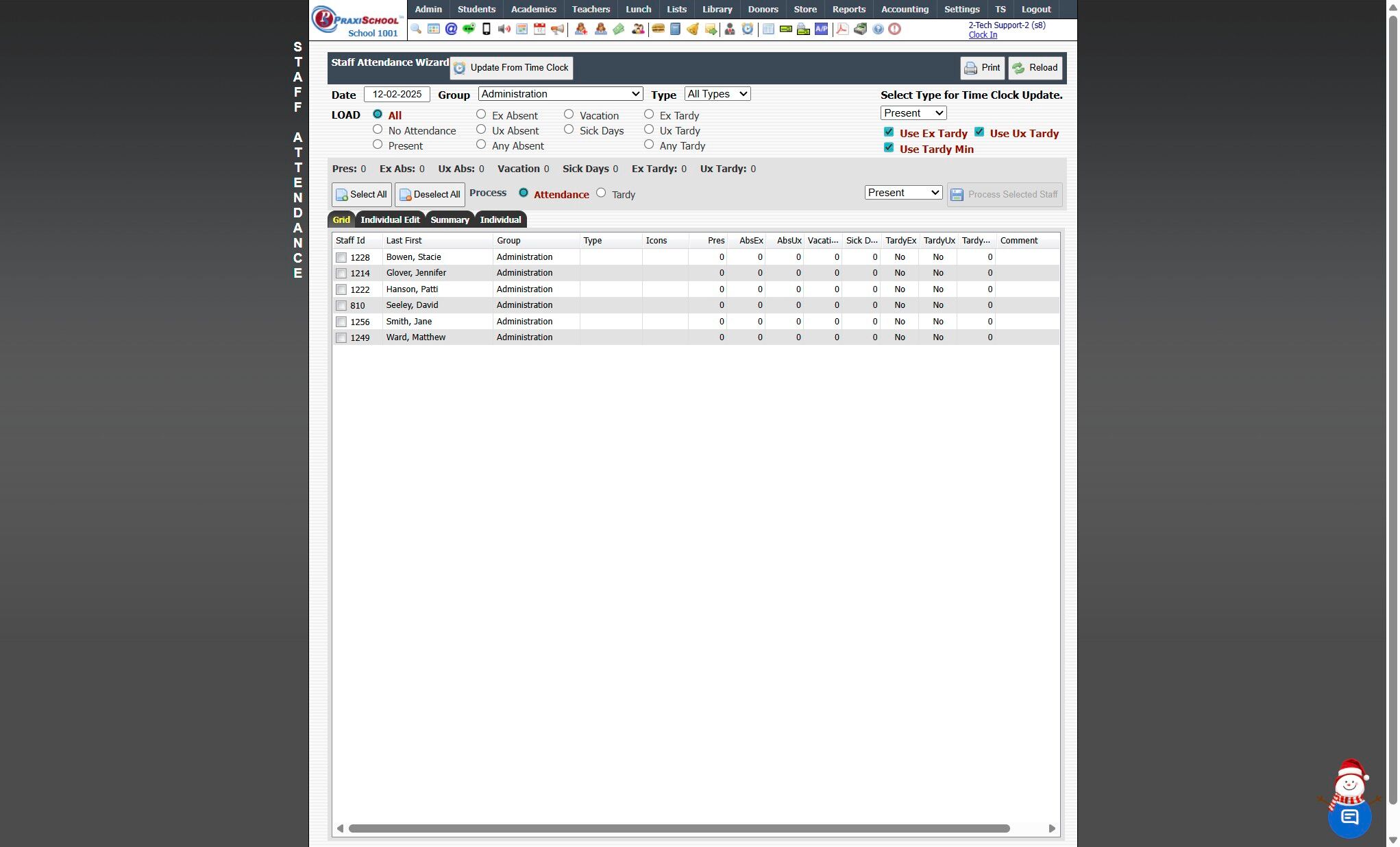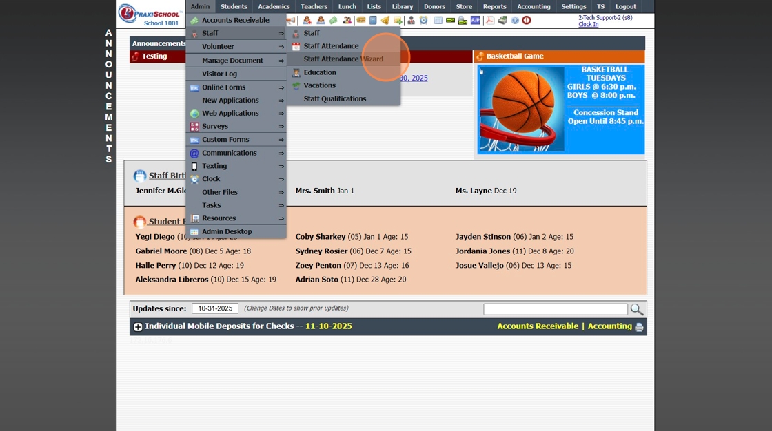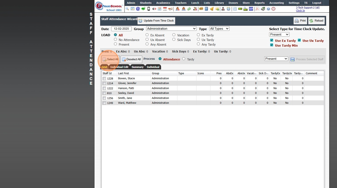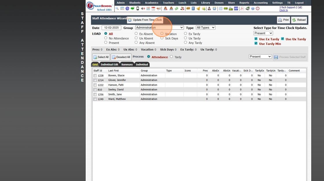 Staff Attendance Reports by Attendance Type 1. Click "Admin" 2. Click "Staff" 3. Click "Staff Attendance Wizard" 4. Select Date (Group can be selected to view Attendance for staff in a specific Staff Group) (Type can be selected to view a specific ...