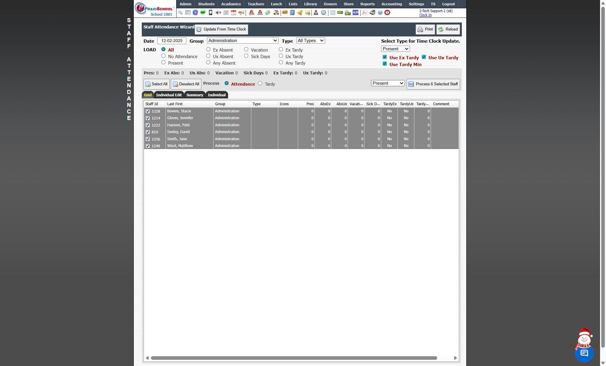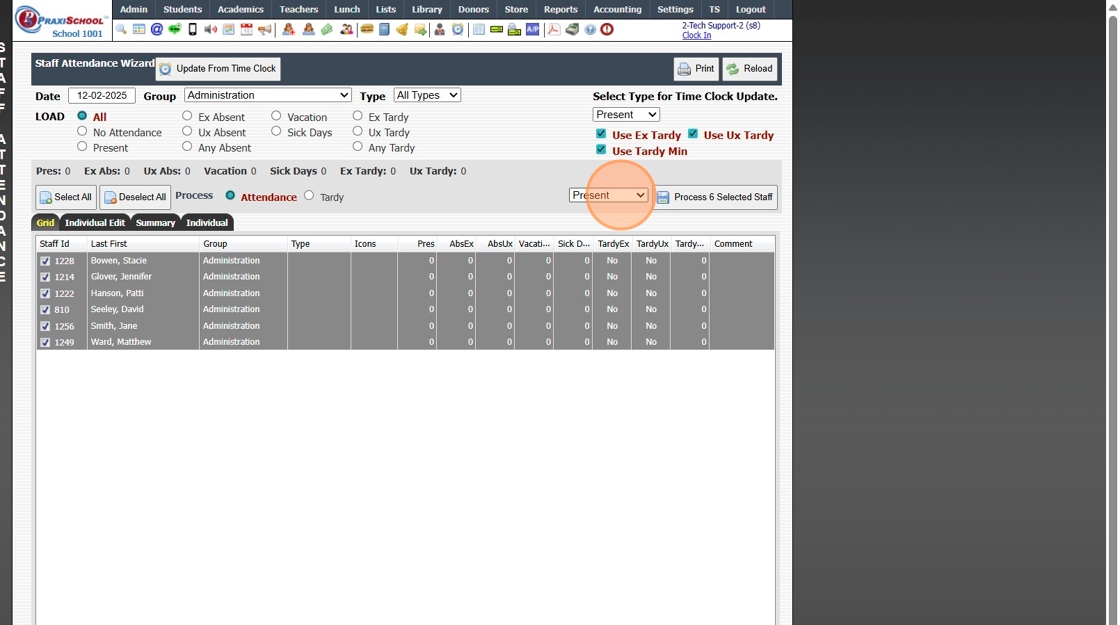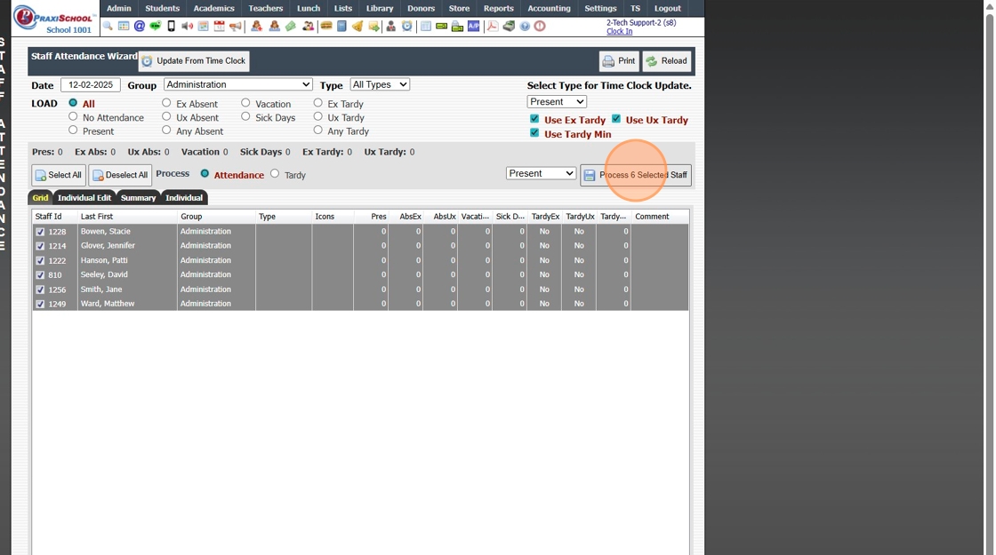 Manually Entering Staff Attendance in Batch 1. Click "Admin" 2. Click "Staff" 3. Click "Staff Attendance Wizard" 4. Tag Staff to Add Attendance for 5. Select the Attendance Type 6. Click "Process # Selected Staff" 1000.2.7