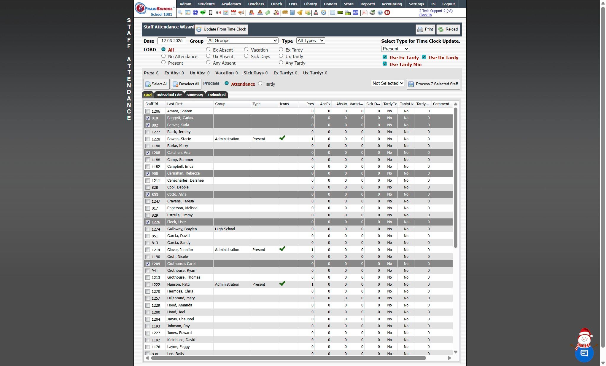 Manually Entering Staff Attendance by Group 1. Click "Admin" 2. Click "Staff" 3. Click "Staff Attendance Wizard" 4. Select Staff Group from Dropdown 5. Click "Select All" 6. Select the Attendance Type 7. Click "Process # Selected Staff" 1000.2.7