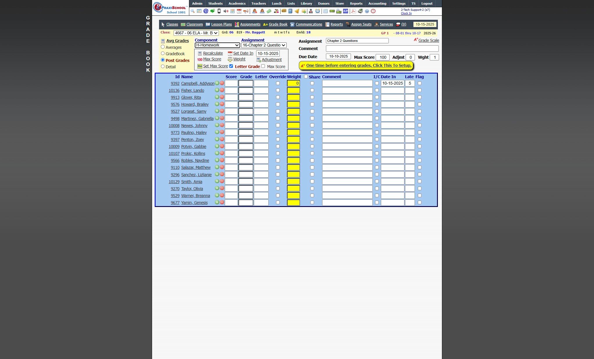 Entering Assignment Grades 1. Log into PraxiSchool 2. Click "Teachers" 3. Click "Classroom" 4. Select Class 5. Click "Grade Book" 6. Select the "Post Grades" Toggle 7. Select Component 8. Select Assignment 9. Click "One time before entering grades, ...