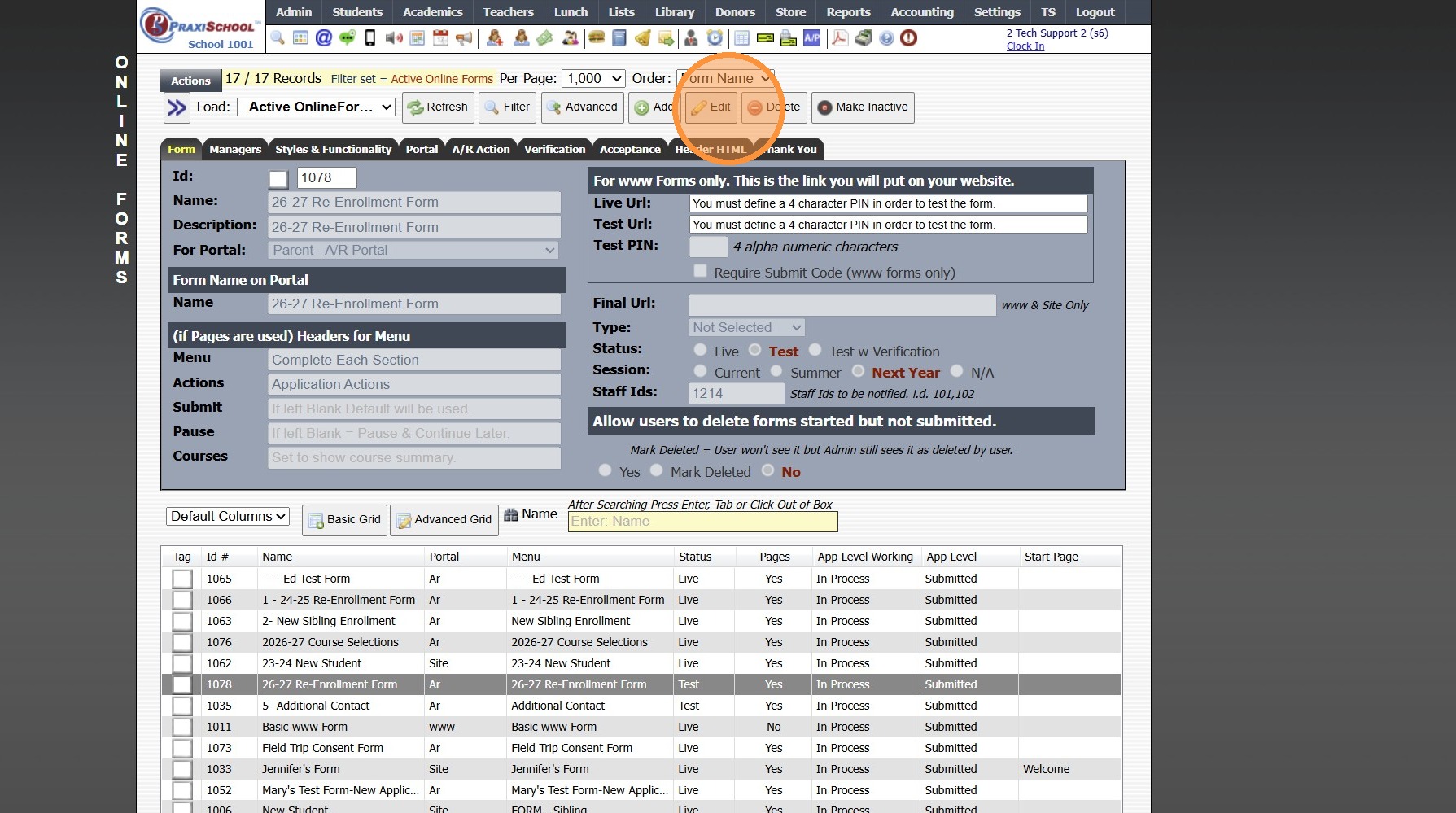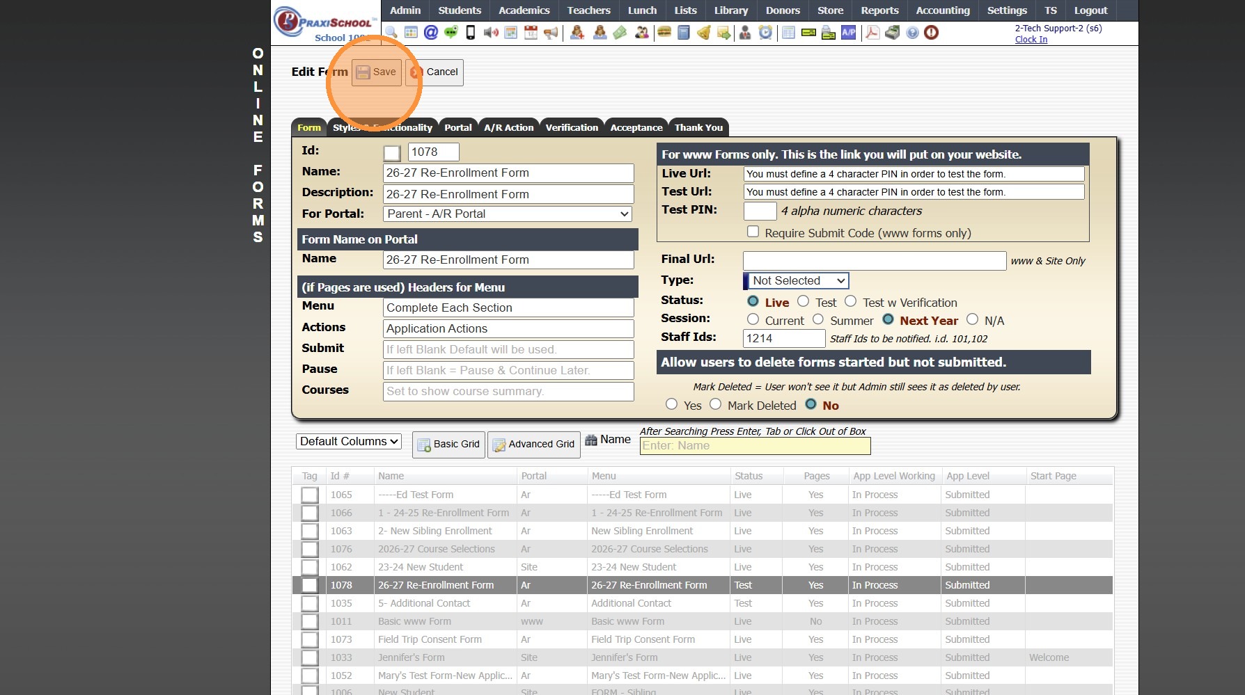 1. Click "Admin" 2. Click "Online Forms" 3. Click "Forms" 4. Click "Add" 5. Add Form Name, Description and Portal Form Name 6. Select the For Portal Option: "Application Site (Only new registration)" 7. Click "Test" to put in Test Mode until Form is ...