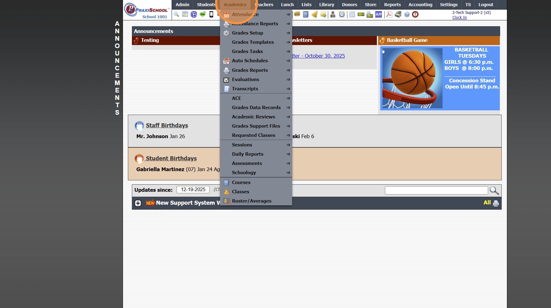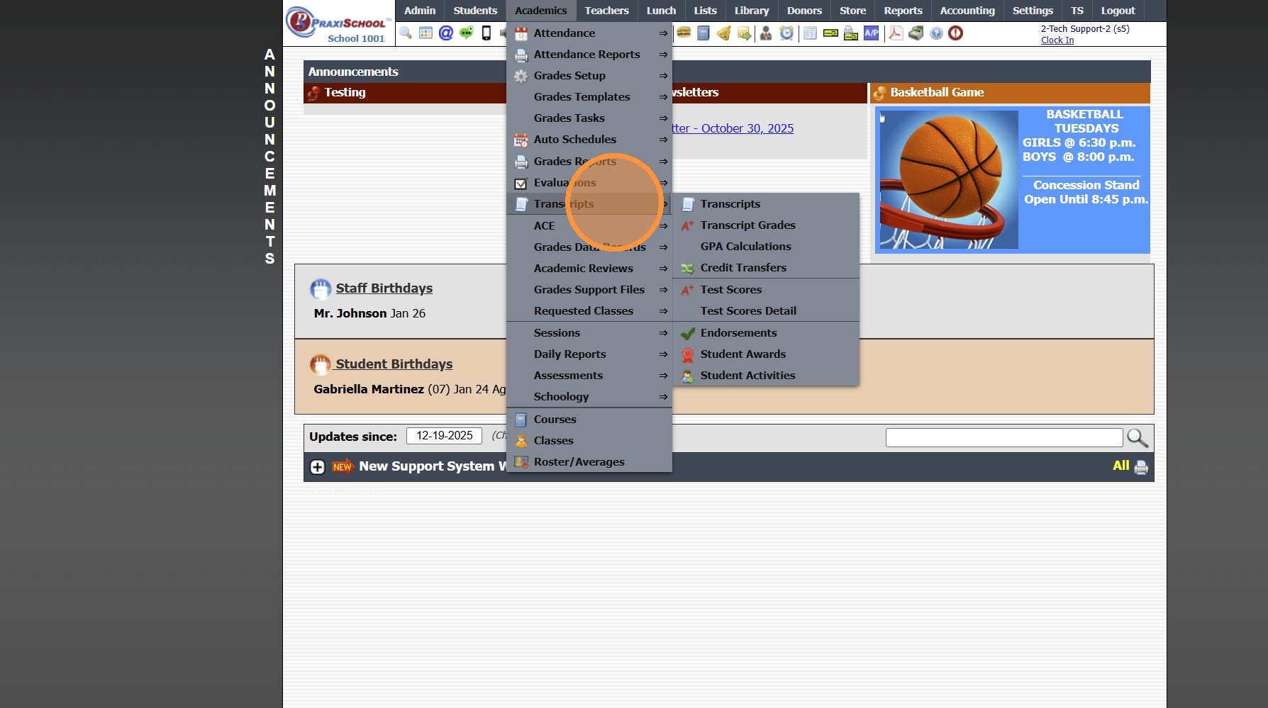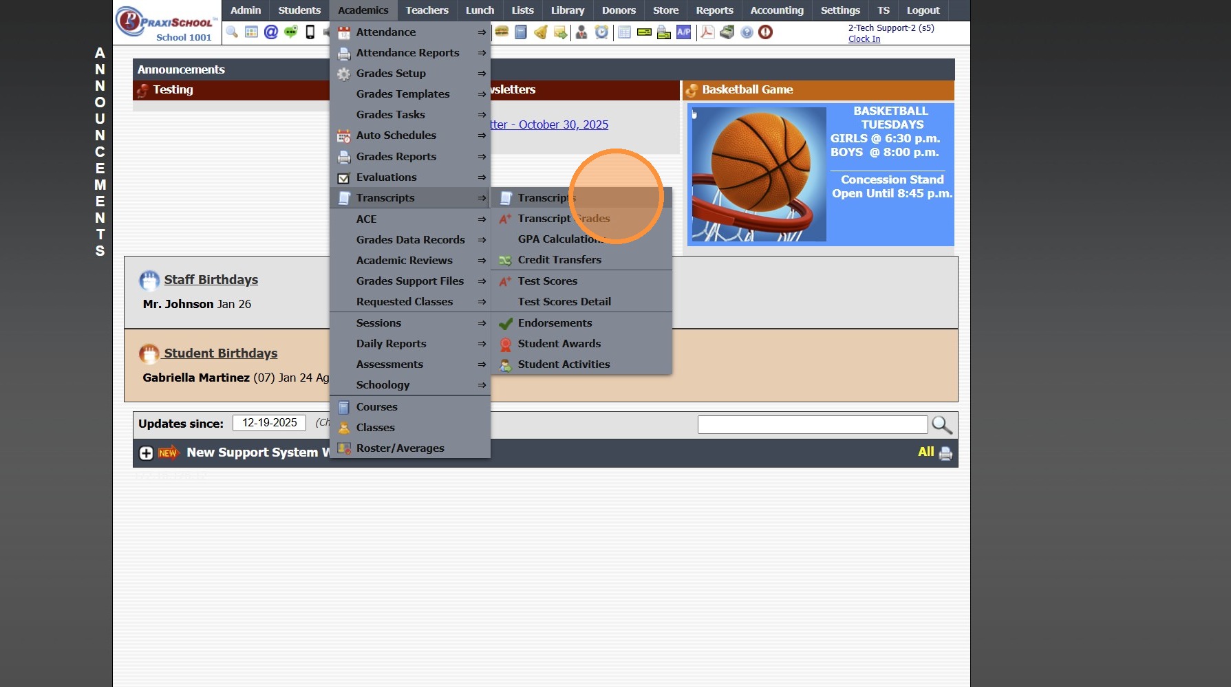 UnPosting Transcript Grades 1. Click "Academics" 2. Click "Transcripts" 3. Click "Transcripts" 4. Click "Actions" 5. Click "UnPost Grades" 6. Select School Year & Semester 7. Click "Save Changes" 8. 2000.8.15