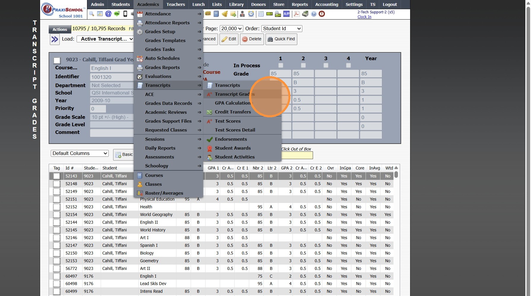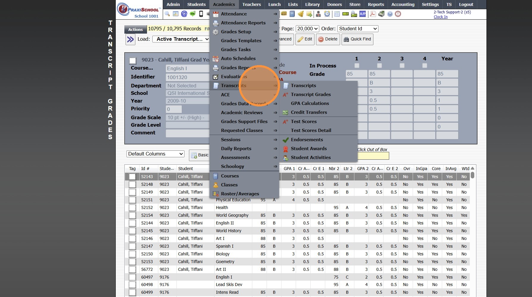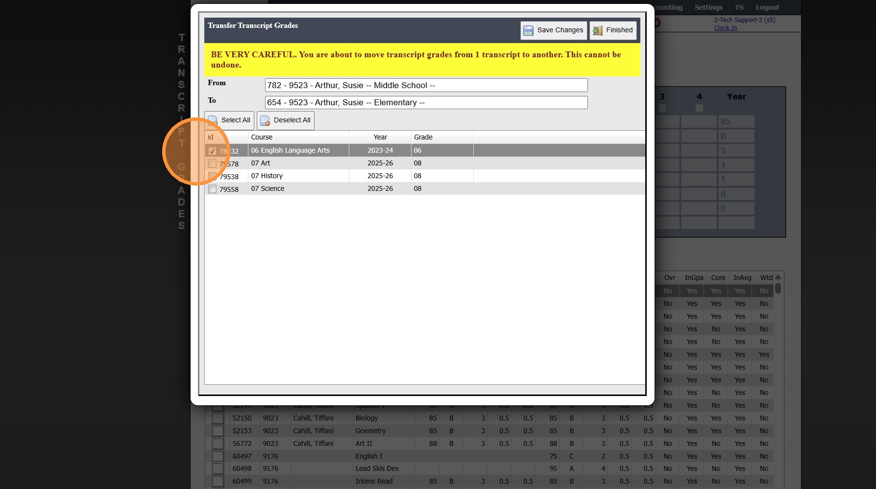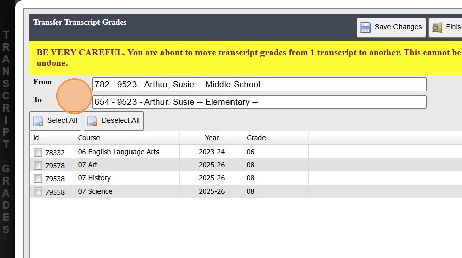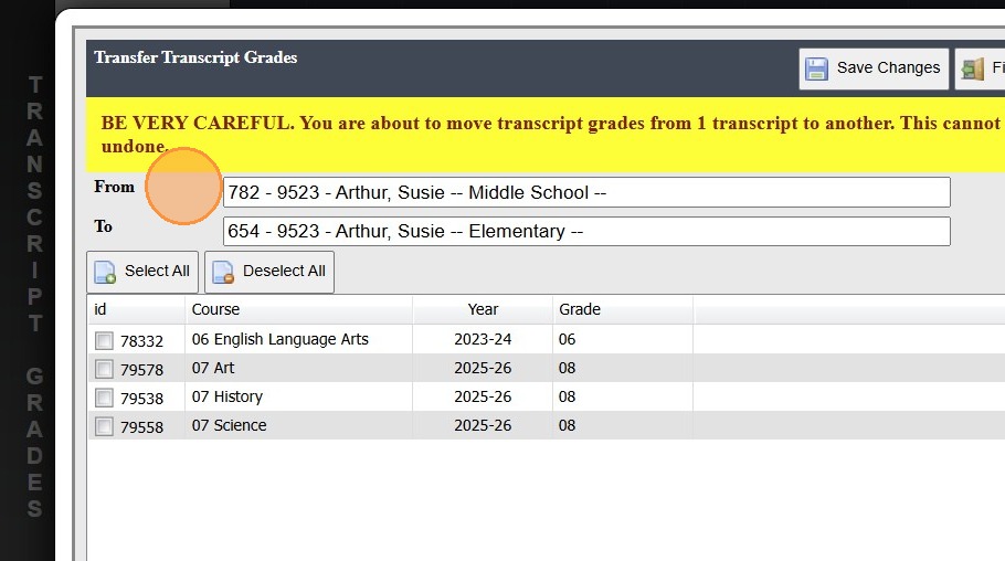 Transferring Grades from one Transcript to Another 1. Click "Academics" 2. Click "Transcripts" 3. Click "Transcript Grades" 4. Click "Actions" 5. Click "Transfer Grades" 6. Search Transcript to Move Grades From 7. Search Transcript to Move Grades To ...