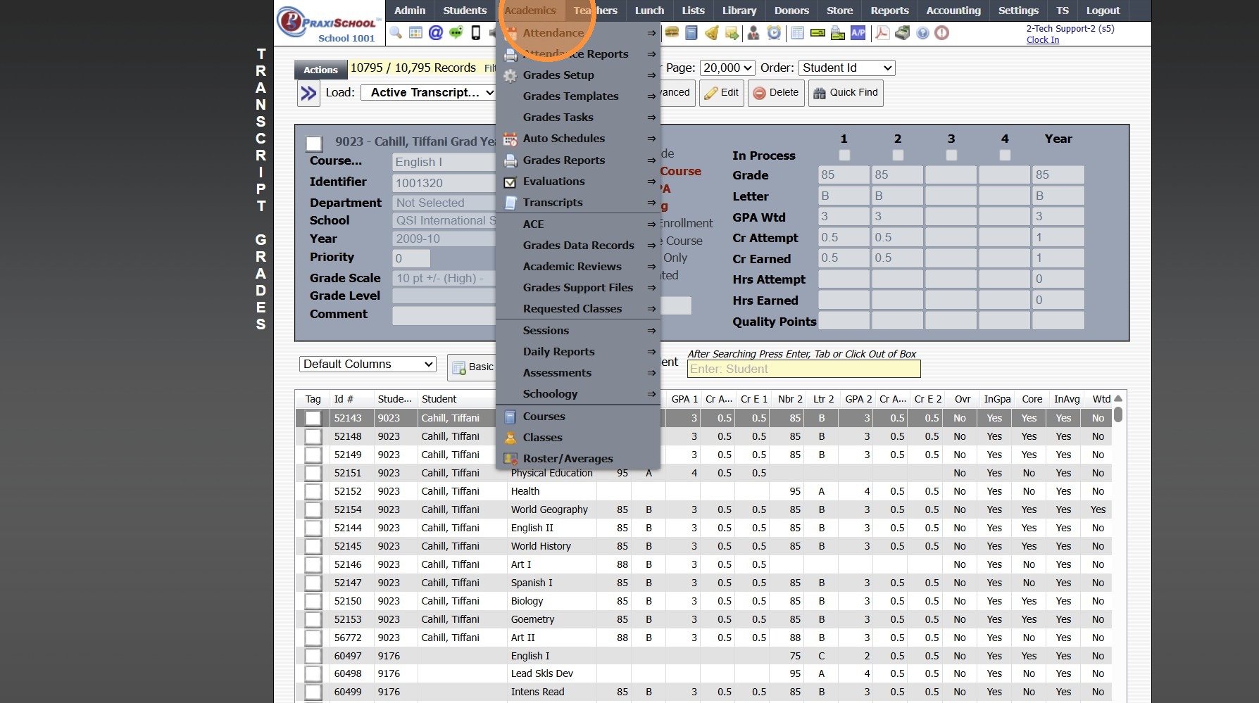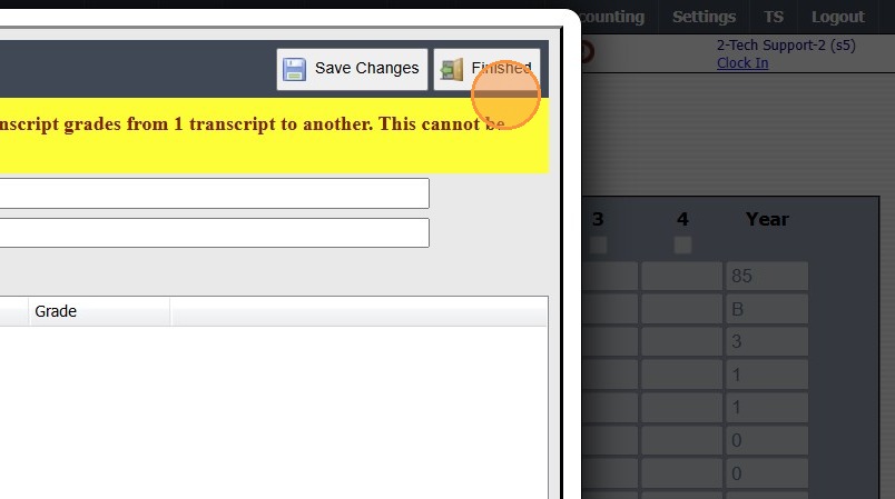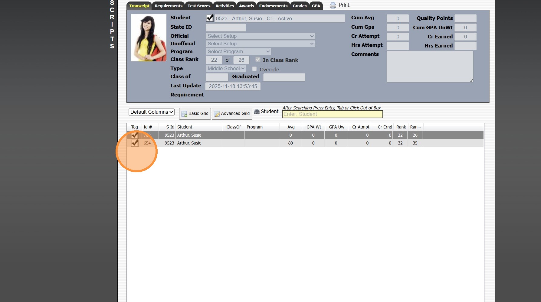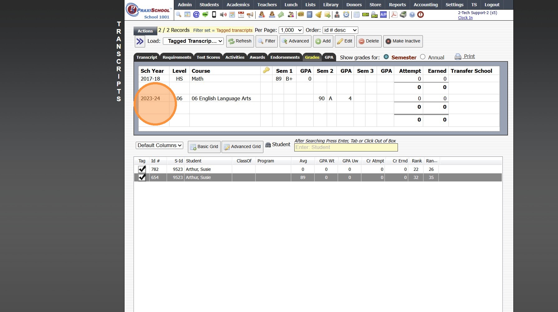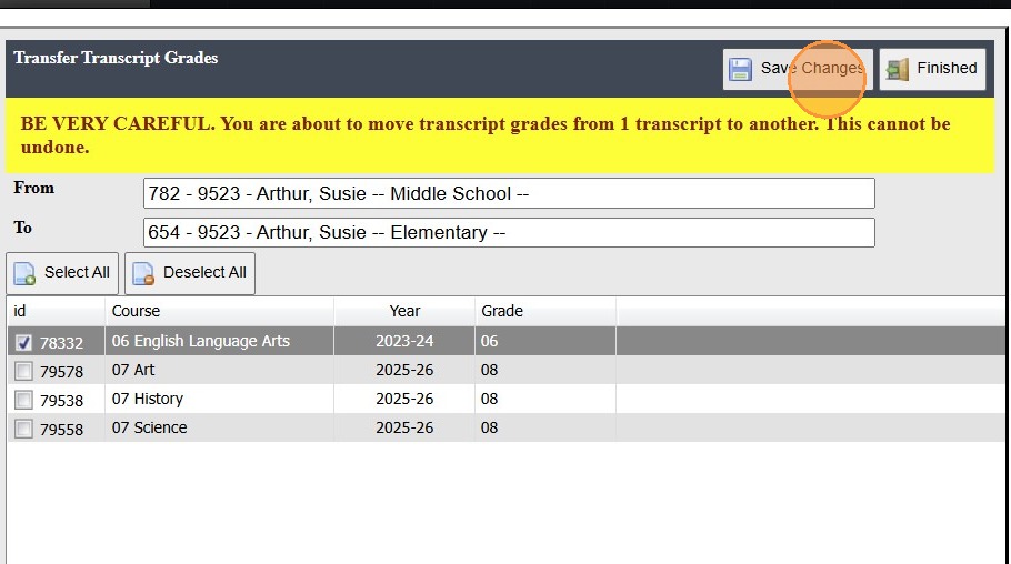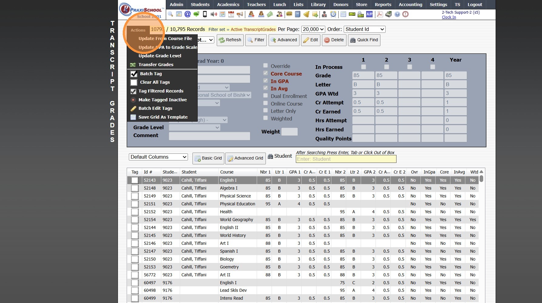Transferring Grades from one Transcript to Another 1. Click "Academics" 2. Click "Transcripts" 3. Click "Transcript Grades" 4. Click "Actions" 5. Click "Transfer Grades" 6. Search Transcript to Move Grades From 7. Search Transcript to Move Grades To ...