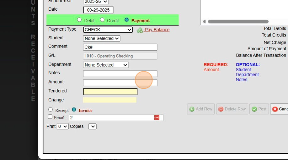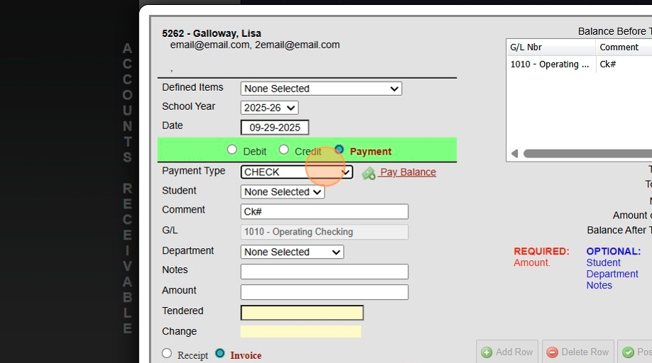 Posting a Check Payment That Includes Both AR & Lunch Payments Posting a Check Payment to the Accounts Receivable that Includes Funds for a Students Lunch Account. 1. Log into PraxiSchool 2. Click "Admin" 3. Click "Accounts Receivable" 4. Search for ...