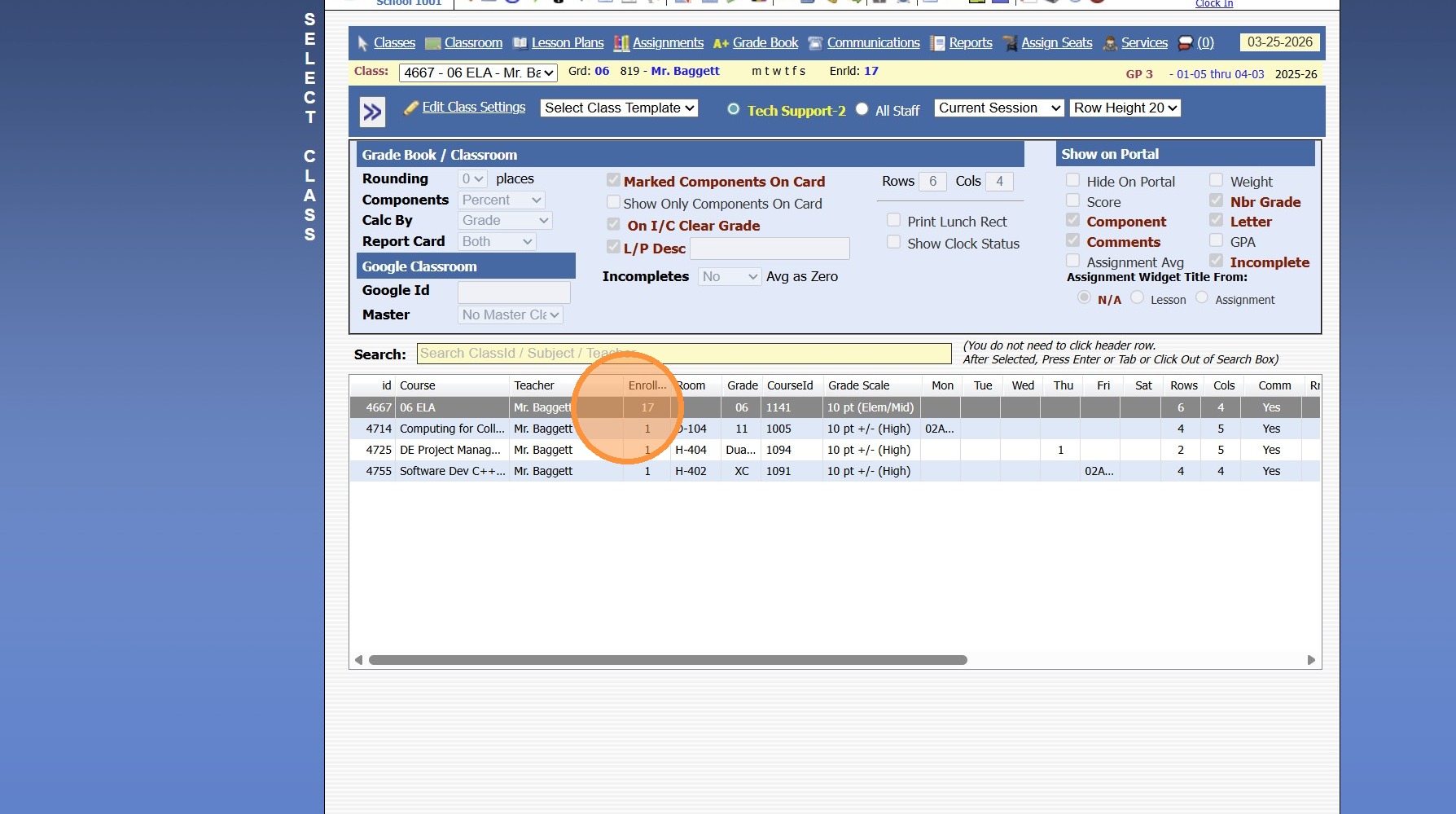 1. Click "Teachers" 2. Click "Classroom" 3. Select Class 4. Click "Grade Book" 5. Select Post Grades Toggle 6. Select the Component 7. Select the Assignment 8. Click the Yellow Bar "One time before entering grades, Click This To Setup" (Clicking the ...