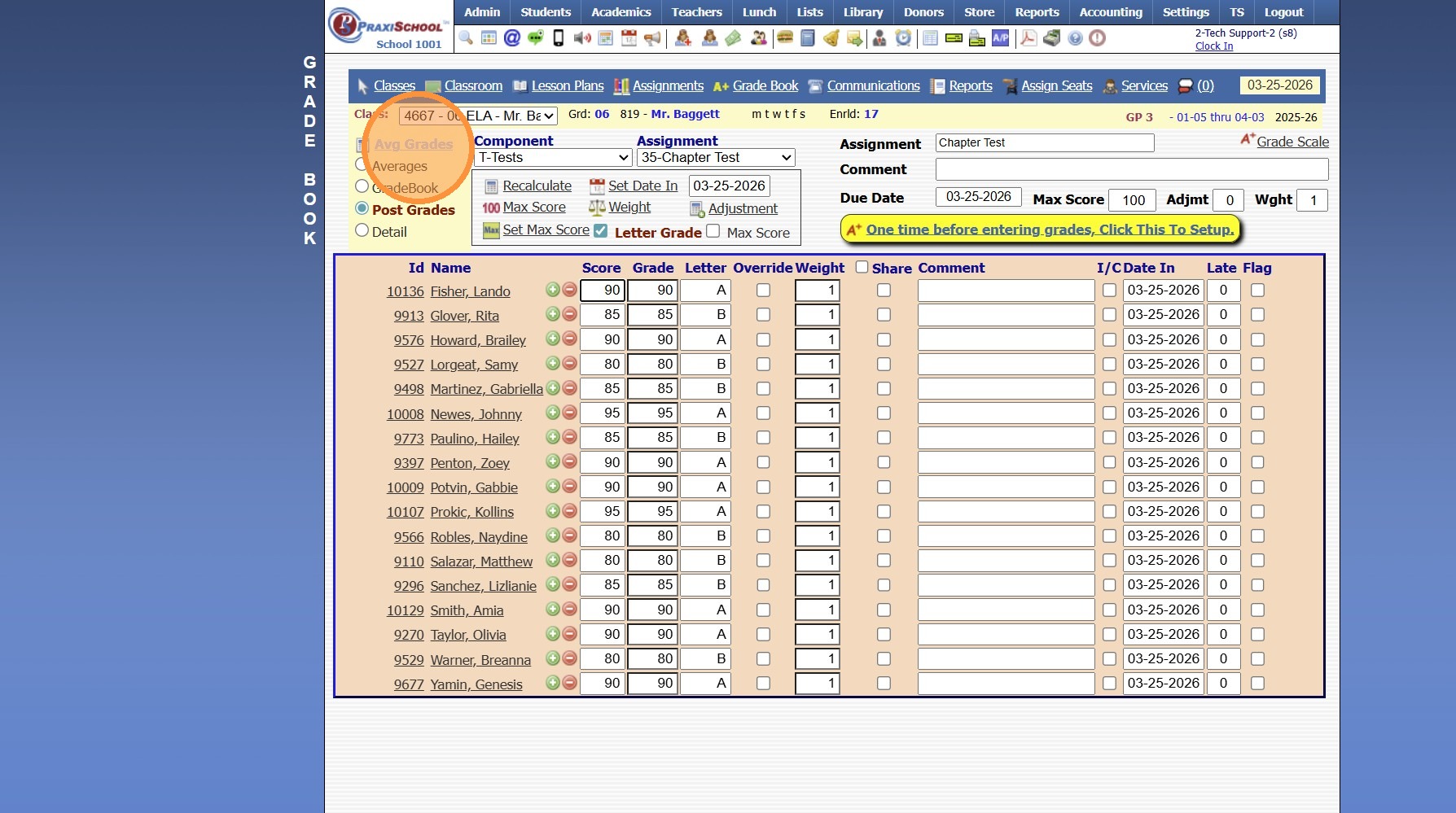 Entering Assignment Grades 1. Log into PraxiSchool 2. Click "Teachers" 3. Click "Classroom" 4. Select Class 5. Click "Grade Book" 6. Select the "Post Grades" Toggle 7. Select Component 8. Select Assignment 9. Click "One time before entering grades, ...
