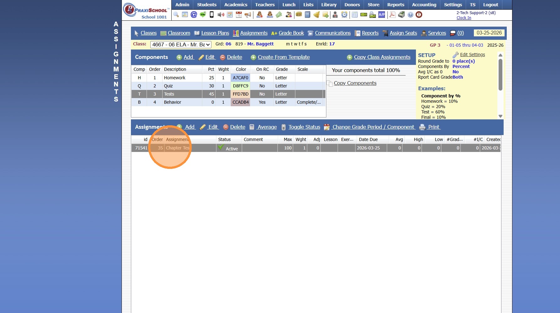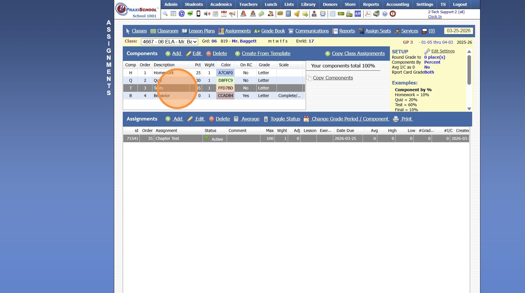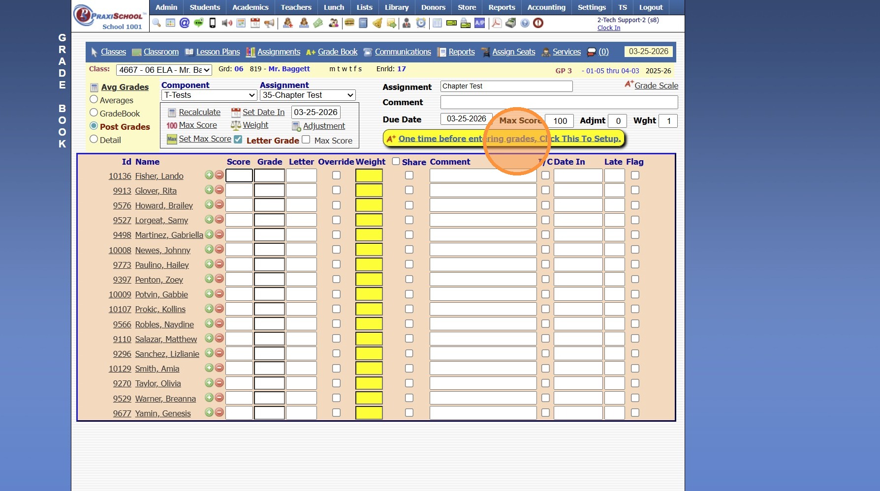 Entering Assignment Grades Using Max Score Max Score can be used to enter the maximum score for each Student. (Ex. a Homework Assignment earns a 100% if turned in and all Students turned in the Assignment) 1. Log into PraxiSchool 2. Click "Teachers" ...