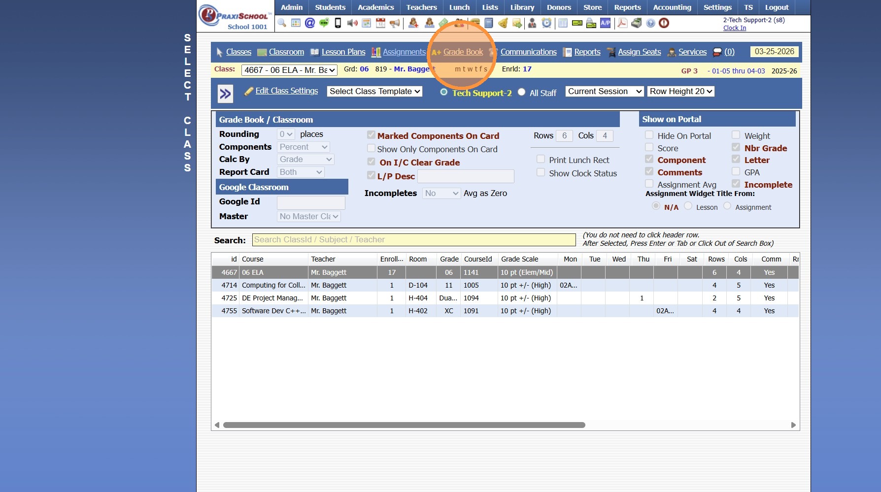 1. Click "Teachers" 2. Click "Classroom" 3. Select Class 4. Click "Grade Book" 5. Select Grade Book Toggle 6. Grade Book of all Student Assignments is Visible 2500.1.29