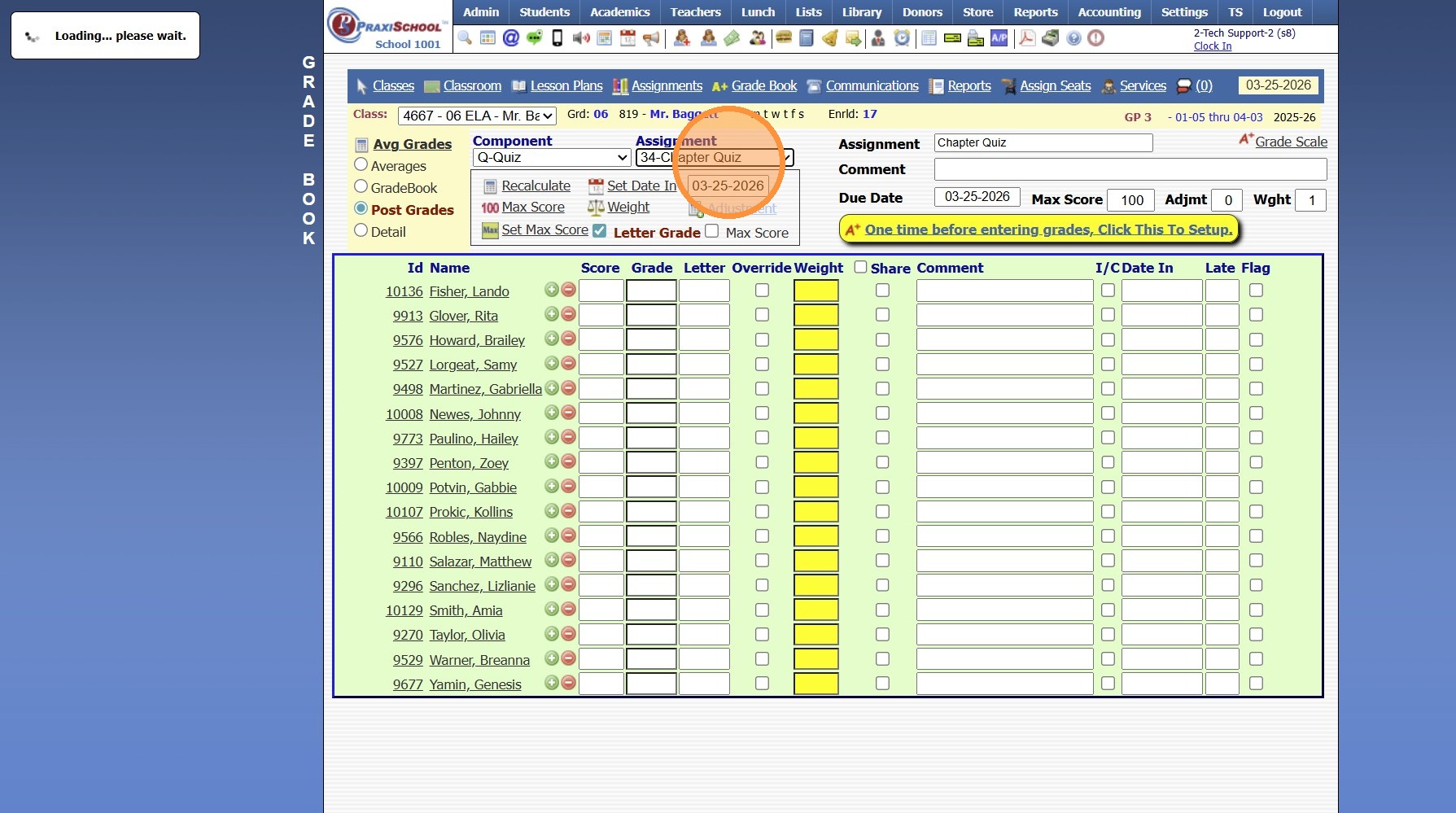 8. Click the Yellow Bar "One time before entering grades, Click This To Setup"