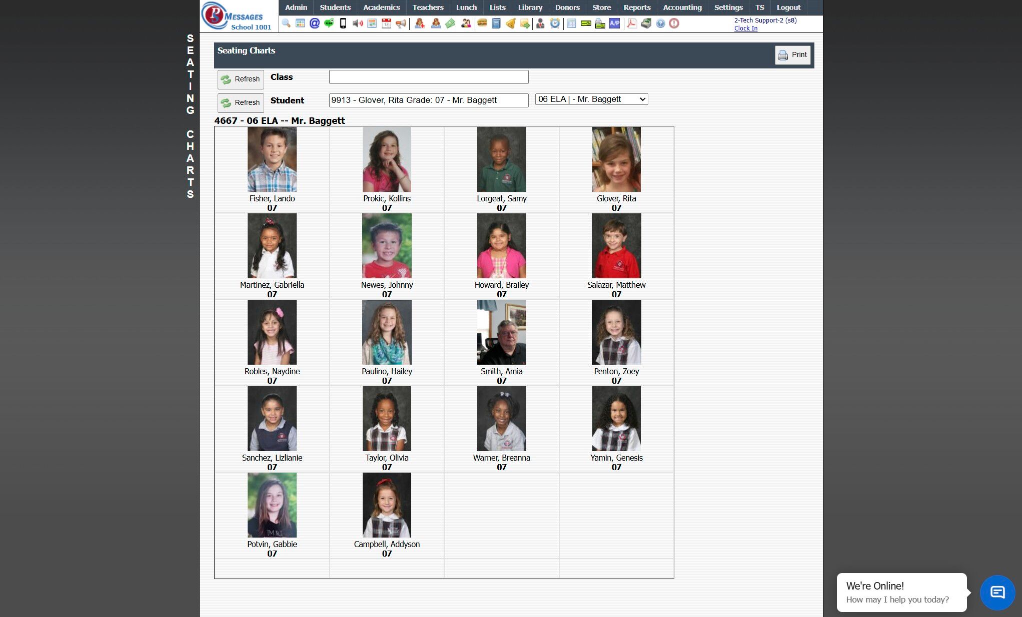 Previewing / Printing a Classroom Seating Chart 1. Click "Teachers" 2. Click "Seating Charts - All" 3. Select Class 4. Click "Refresh" 5. Class Seating Chart will Populate on Screen 6. Click "Print" to Print Seating Chart for Class 2500.5.1