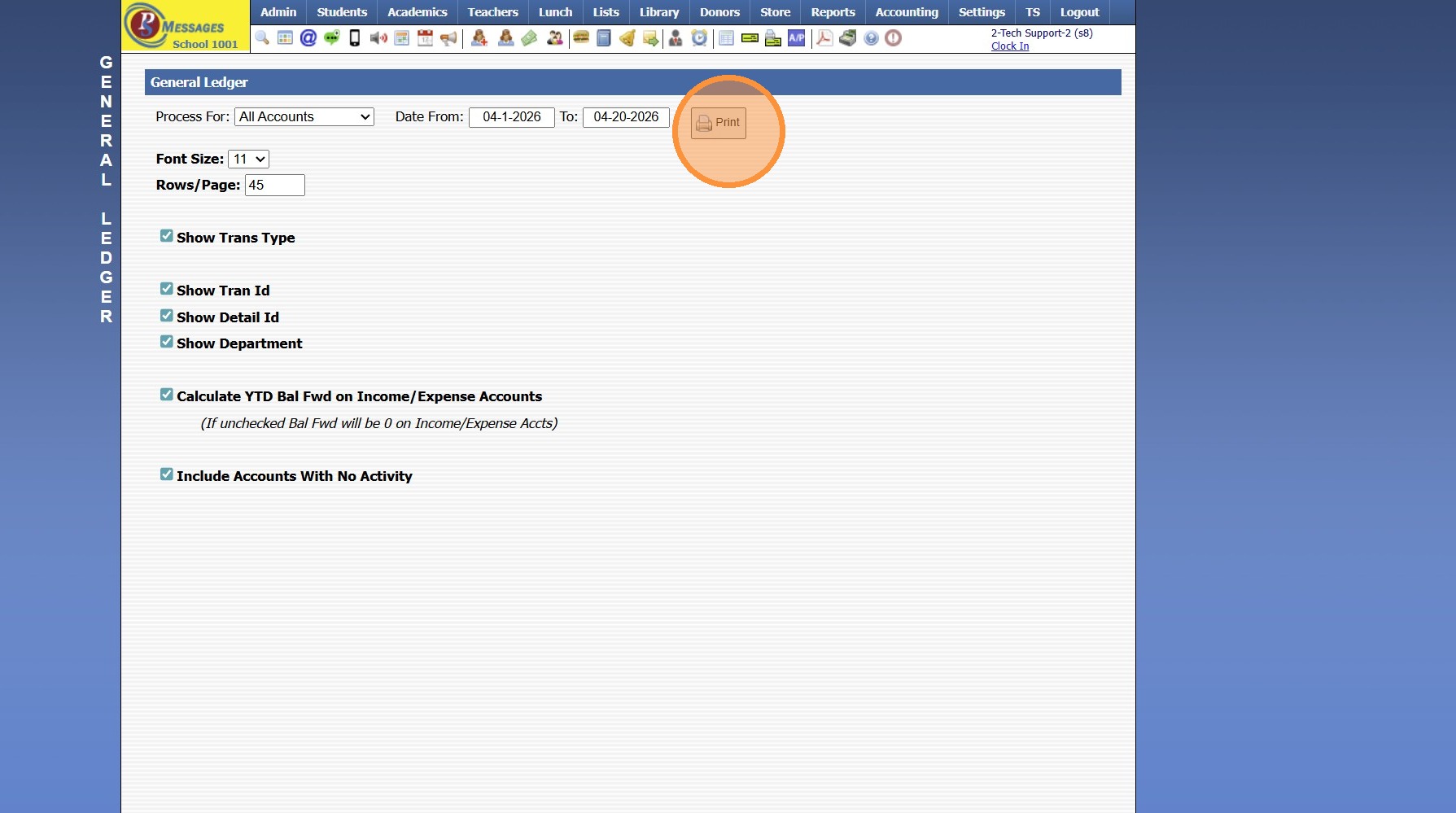 1. Click "Accounting" 2. Click "Reports" 3. Click "General Ledger" 4. Select "1 Account" from Dropdown Menu 5. Select the Account 6. Set Date Range 7. Click "Print" 8. Select Print, Email, Export or PDF (If Selecting Email, Verify the Email Address) ...