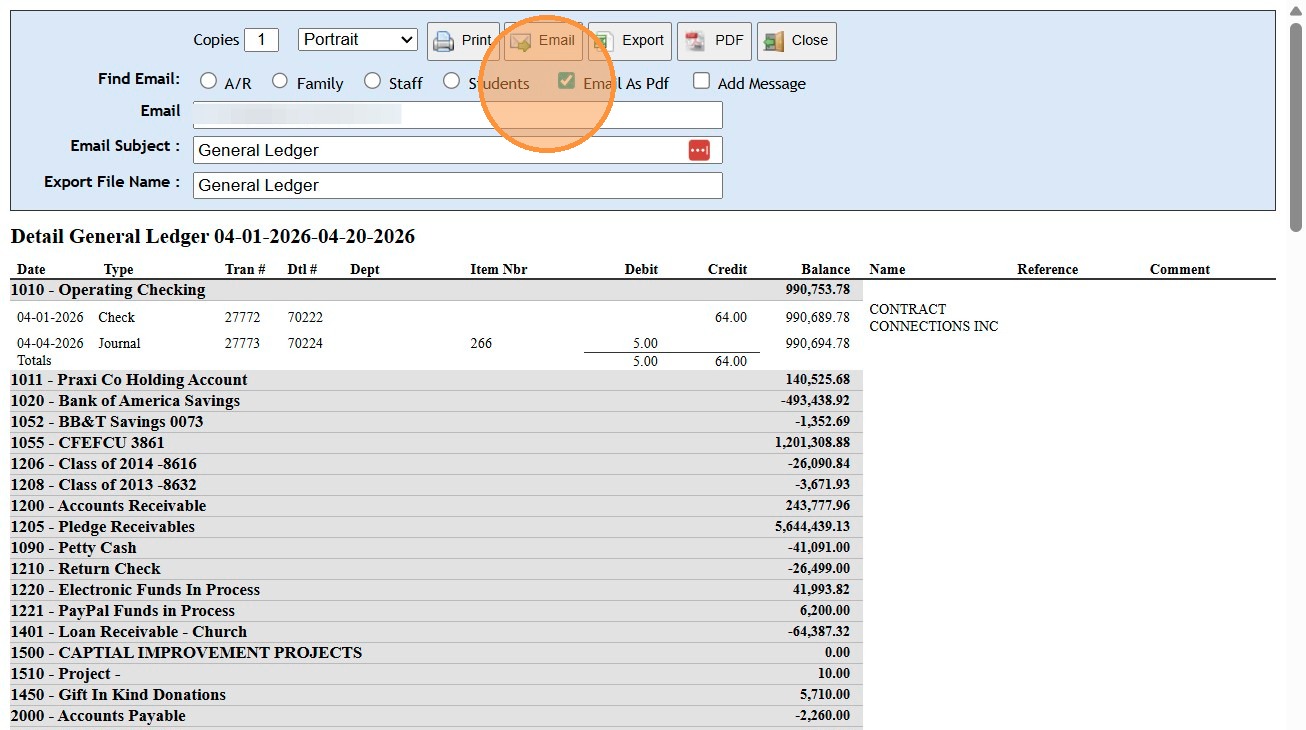 Print, Email, Export or Generate a PDF General Ledger Report (1 Account)
