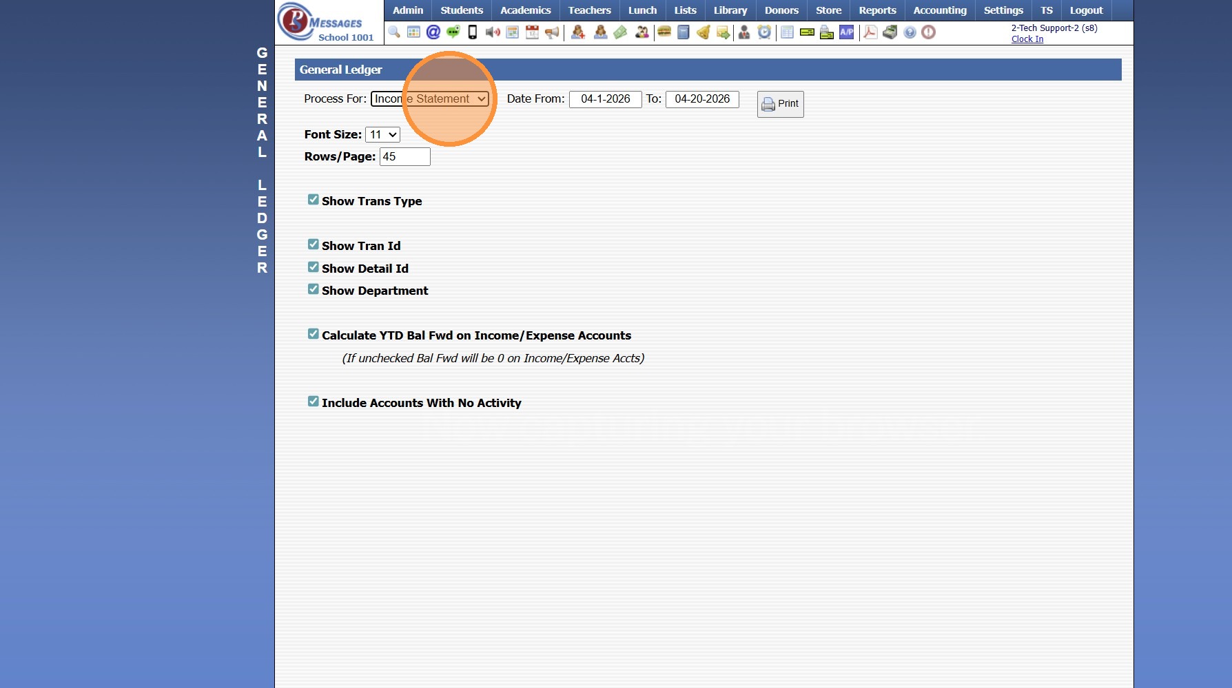 1. Click "Accounting" 2. Click "Reports" 3. Click "General Ledger" 4. Select "Income Accounts" from Dropdown Menu 5. Set Date Range 6. Click "Print" 7. Select Print, Email, Export or PDF (If Selecting Email, Verify the Email Address) 6000.10.14
