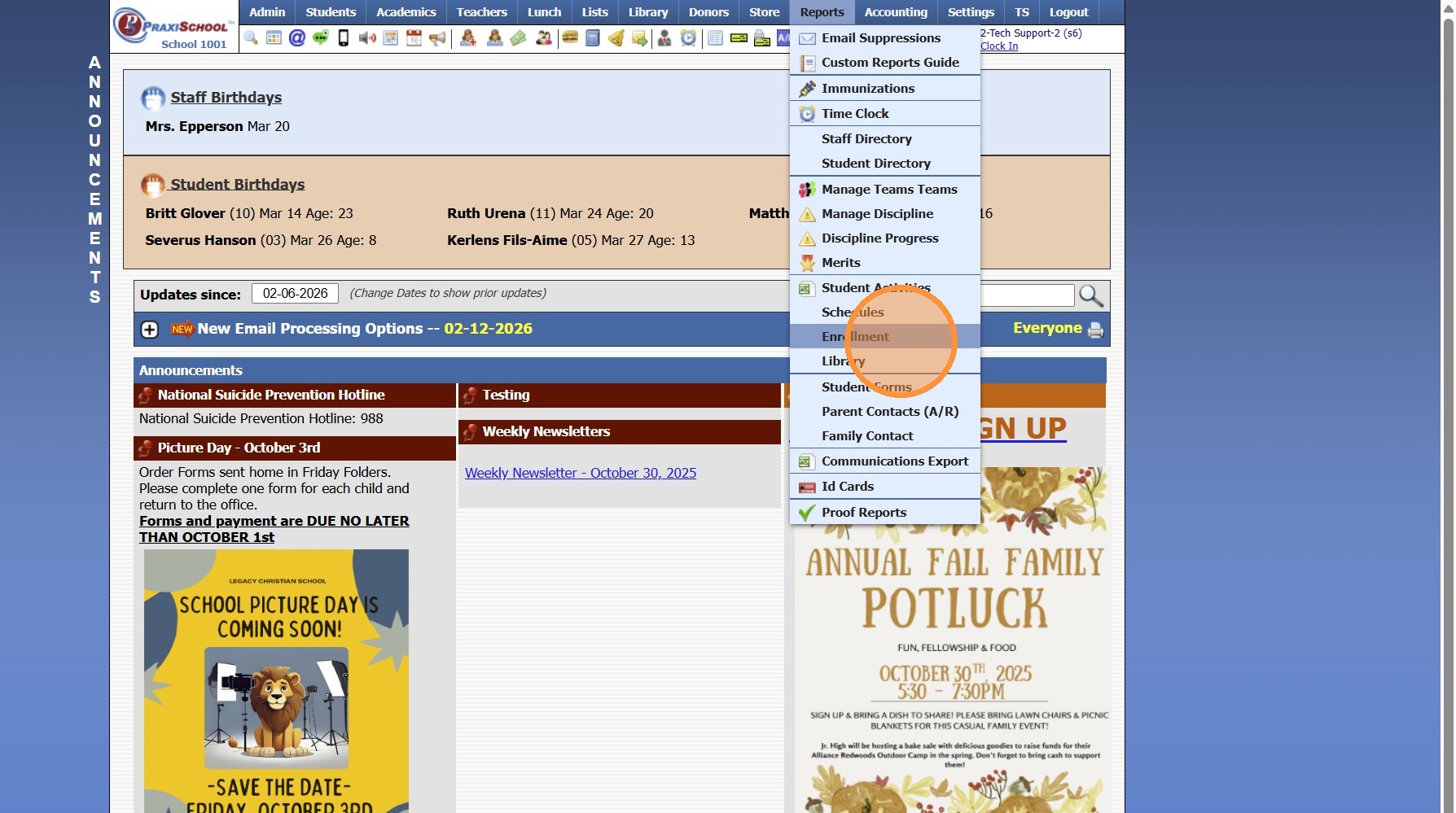 1. Click "Reports" 2. Click "Enrollment" Manually Selecting Report Options 3. Select the "For" option, "Enrolled" option, "Summer" option and/or the "Next Year" option 4. Select desired options for the Report 5. Select to Generate Enrollment Report ...