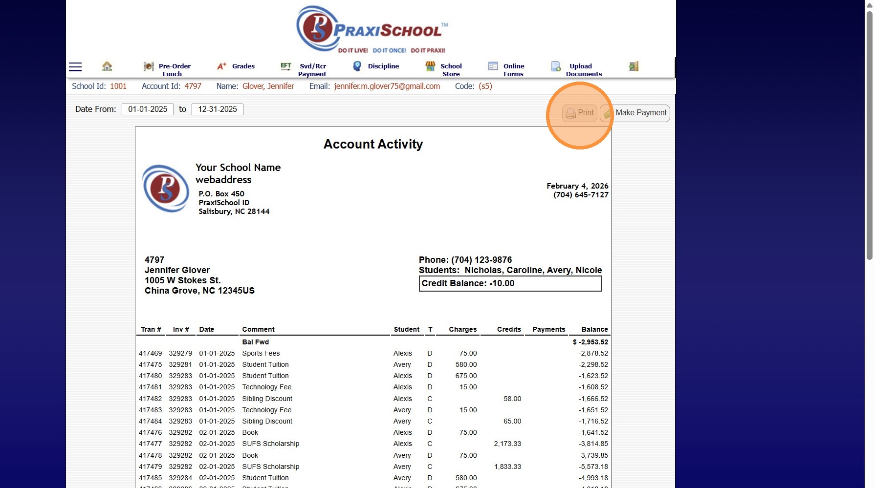 8. Printed Account Activity will Generate with the Total at the Bottom