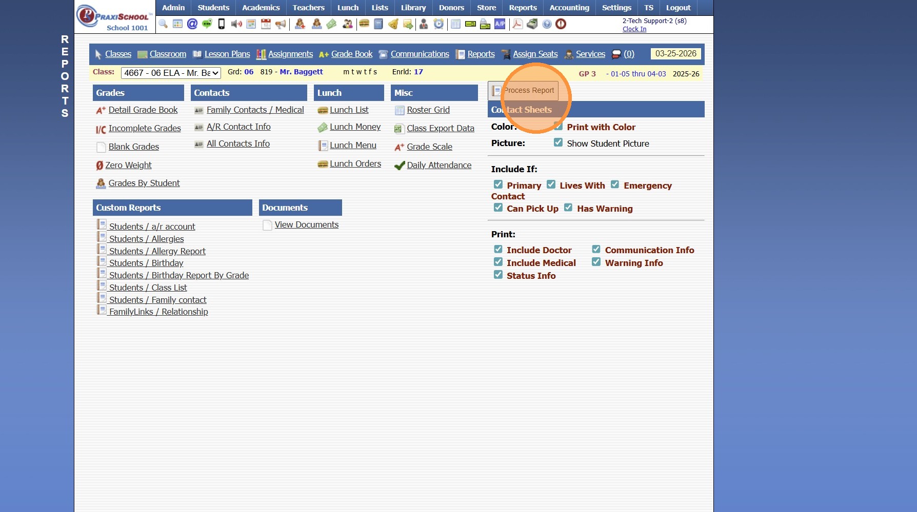 1. Click "Teachers" 2. Click "Classroom" 3. Select Class 4. Click "Reports" 5. Select "Family Contacts / Medical" 6. Select Options to Appear on Contact Report 7. Click "Process Report" 8. Report will Generate to Print, Email or Export to PDF ...