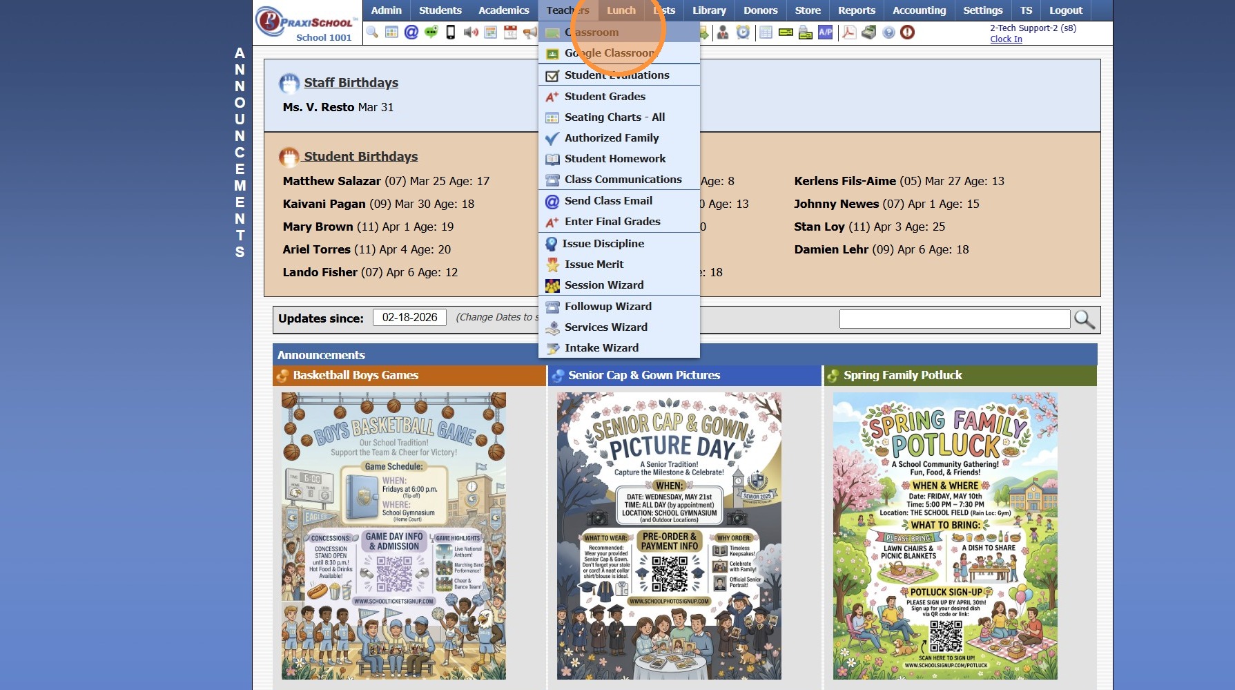 Viewing Student Contacts in the Classroom 1. Log into PraxiSchool 2. Click "Teachers" 3. Click "Classroom" 4. Select Class 5. Click "Classroom" 6. Click the "Class Info" field 7. Left Click the Student Profile 8. Click "Contacts" 9. Student's Contact ...