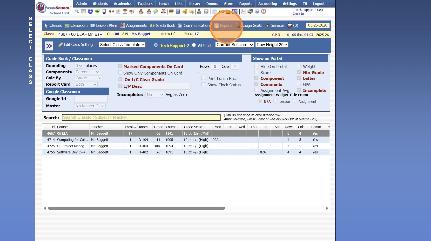 1. Click "Teachers" 2. Click "Classroom" 3. Select Class 4. Click "Reports" 5. Select "A/R Contact Info" 6. Select Student and/or Parent ID options 7. Click "Process Report" 8. Report will Generate to Print, Email or Export to PDF 2500.1.36