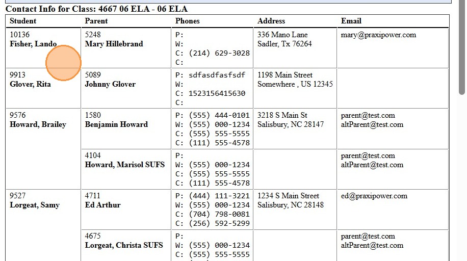Viewing Student Contacts in the Classroom 1. Log into PraxiSchool 2. Click "Teachers" 3. Click "Classroom" 4. Select Class 5. Click "Classroom" 6. Click the "Class Info" field 7. Left Click the Student Profile 8. Click "Contacts" 9. Student's Contact ...