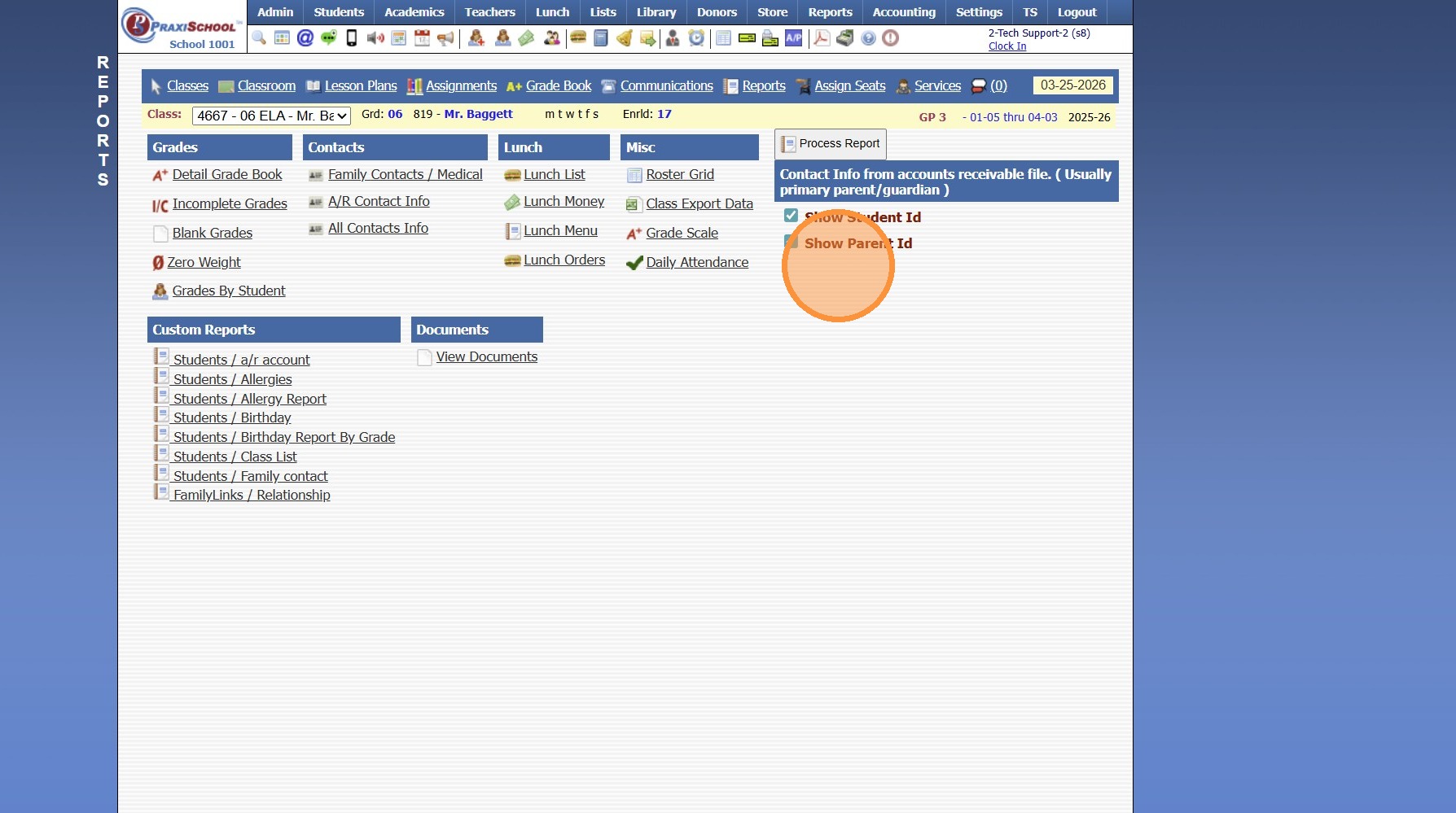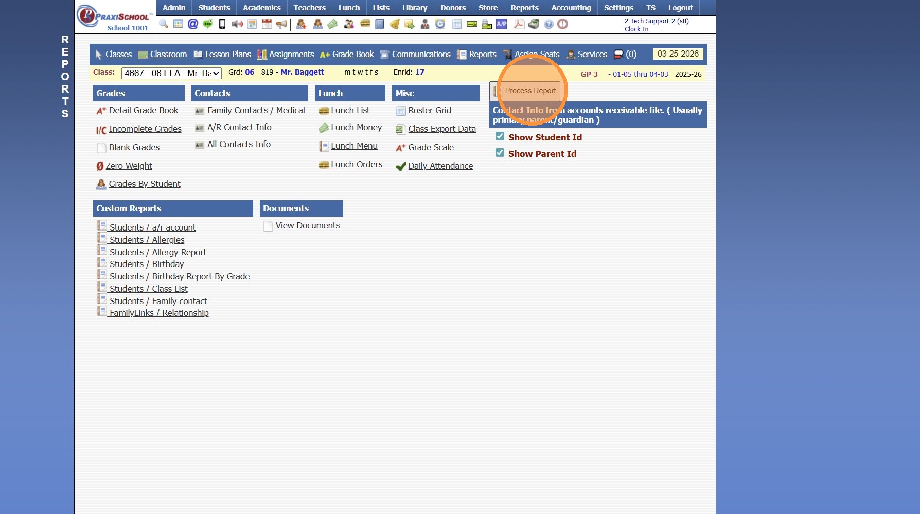 1. Click "Teachers" 2. Click "Classroom" 3. Select Class 4. Click "Reports" 5. Select "All Contacts Info" 6. To Add Student Pictures, Check the Show Pics Box 7. Click "Process Report" 8. Report will Generate to Print, Email or Export to PDF 2500.1.36