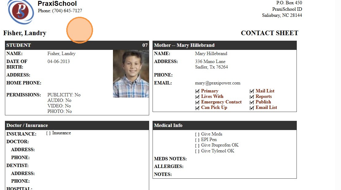 Accessing/Printing Student Family Contact Lists 1. Log into PraxiSchool 2. Click "Students" 3. Click "Students" 4. Select Student 5. Click "Actions" 6. Click "Family Contacts" 7. Student Contact Sheet Options: Print, Email or Download to a PDF ...
