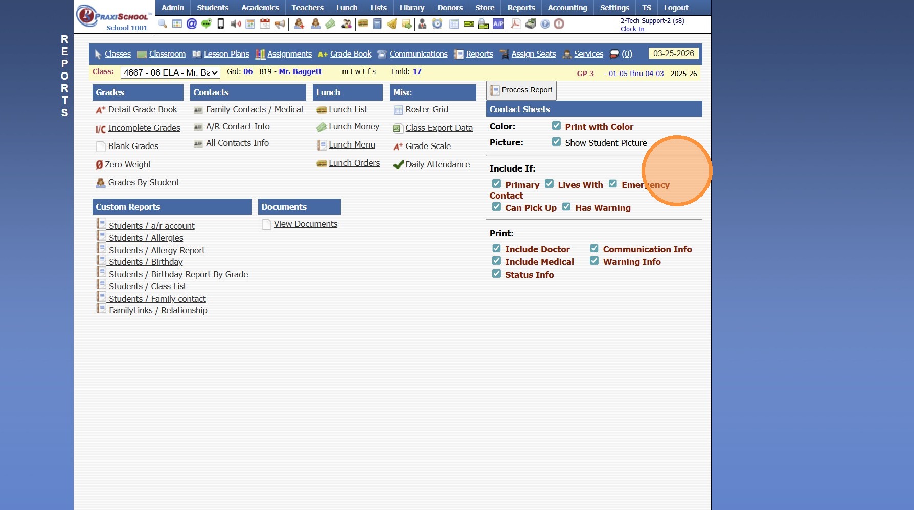 1. Click "Teachers" 2. Click "Classroom" 3. Select Class 4. Click "Reports" 5. Select "All Contacts Info" 6. To Add Student Pictures, Check the Show Pics Box 7. Click "Process Report" 8. Report will Generate to Print, Email or Export to PDF 2500.1.36