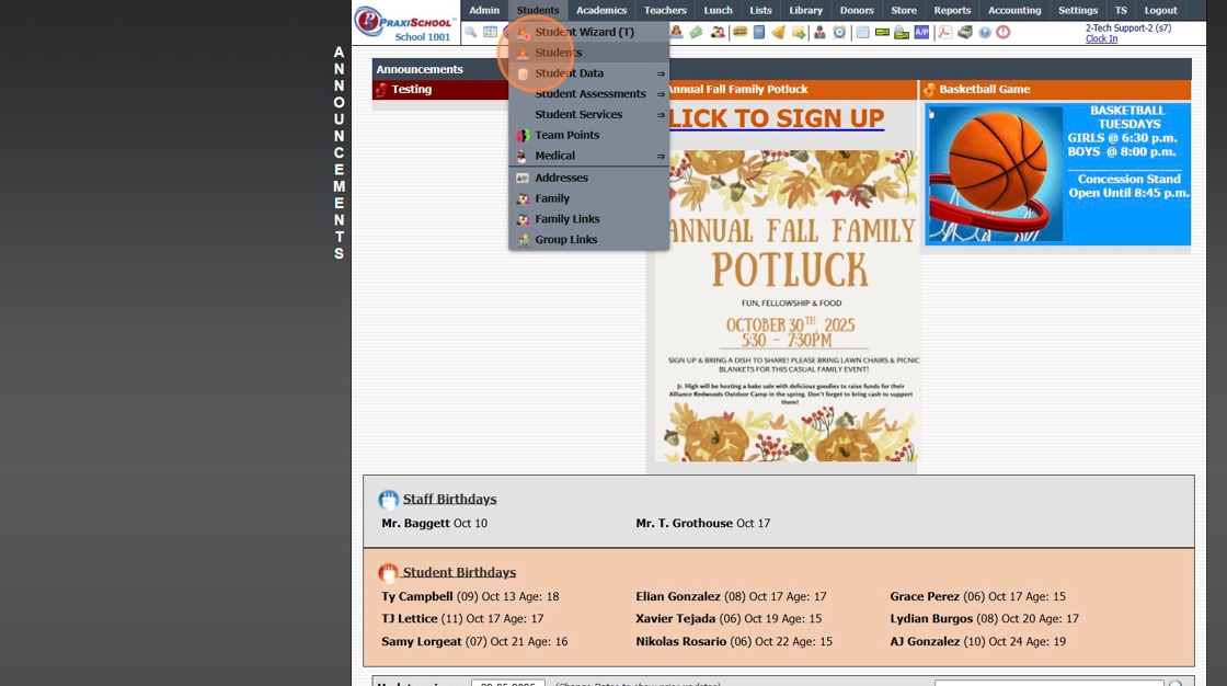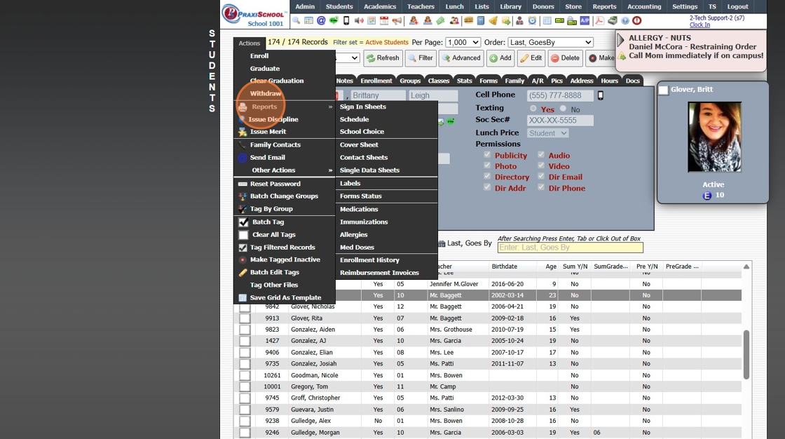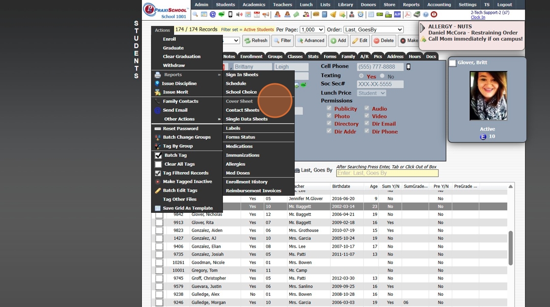 Printing Student Contact Sheets in Batch 1. Log into PraxiSchool 2. Click "Students" 3. Click "Students" 4. Click "Actions" 5. Click "Contact Sheets" 6. Select Print For Option (Single, Active, Tagged, Grade Level, Class OR Homeroom Teacher) 7. ...