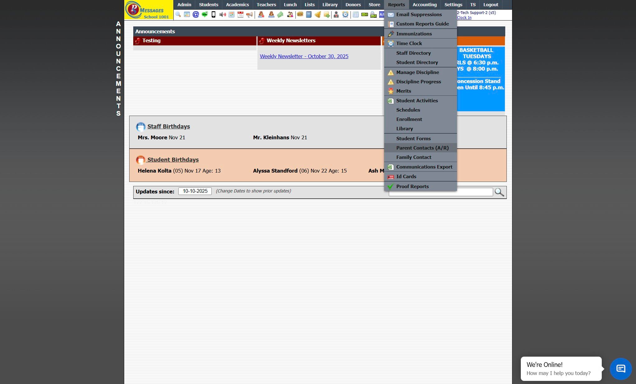 1. Click "Teachers" 2. Click "Classroom" 3. Select Class 4. Click "Reports" 5. Select "A/R Contact Info" 6. Select Student and/or Parent ID options 7. Click "Process Report" 8. Report will Generate to Print, Email or Export to PDF 2500.1.36