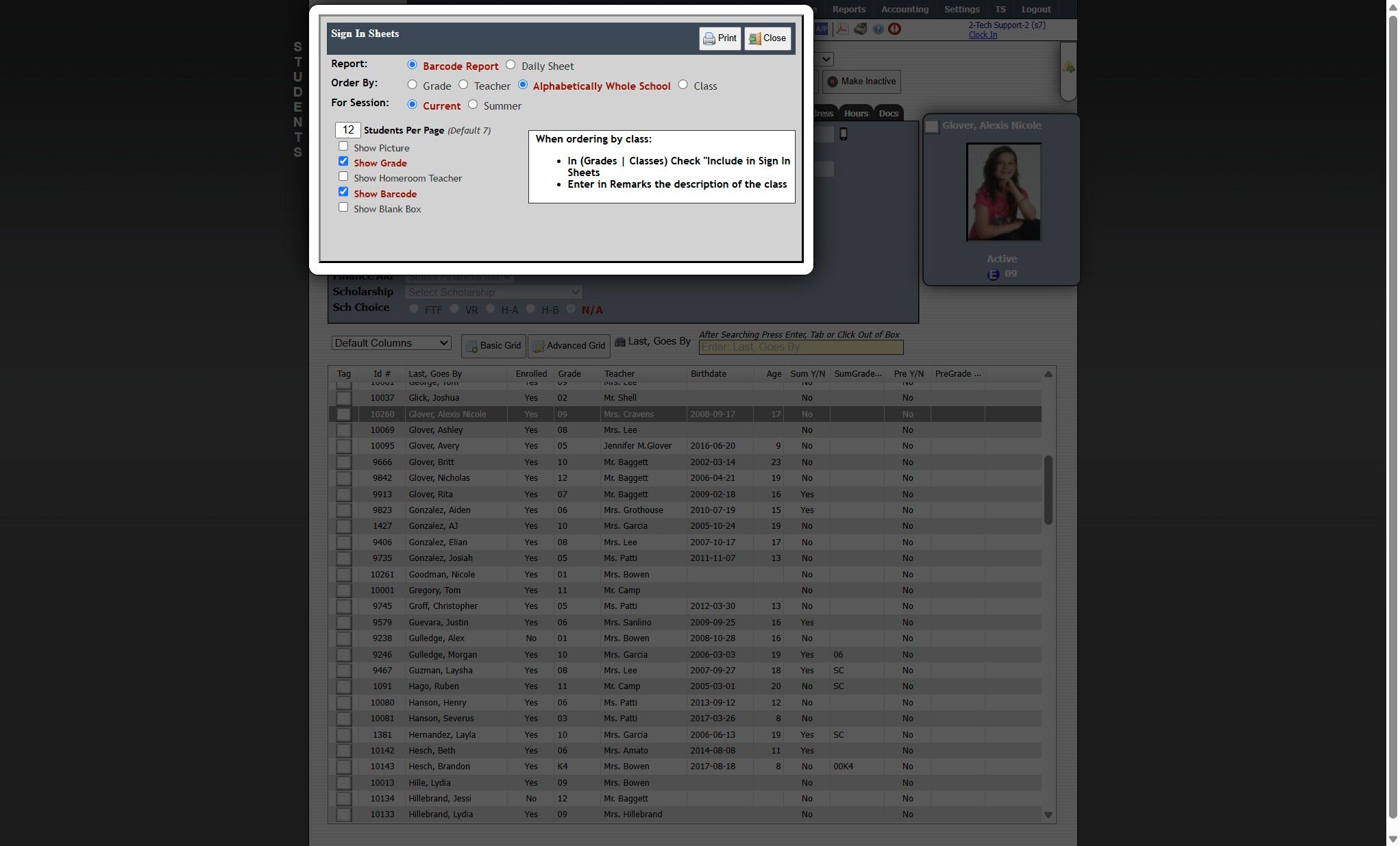 1. Click "Students" 2. Click "Students" 3. Click "Actions" 4. Click "Reports" 5. Click "Sign In Sheets" 6. Click "Barcode Report" 7. Select Order By Preference 8. Select For Session Preference 9. Select Student Per Page Option & Other Print Options ...