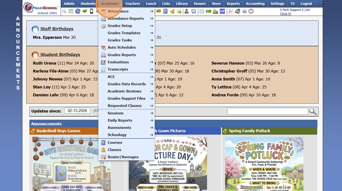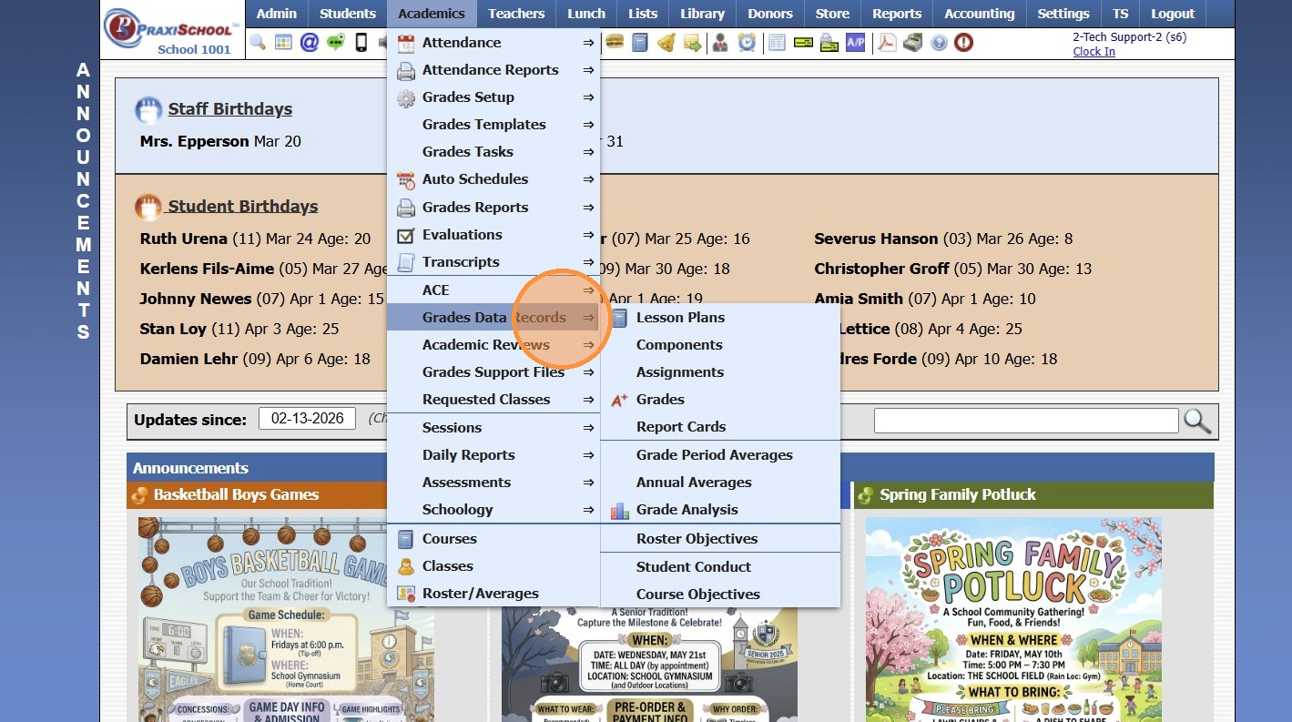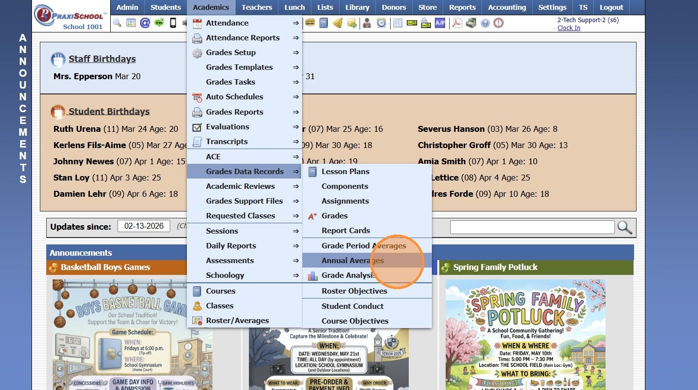 Printing Class Averages 1. Click "Academics" 2. Click "Grades Reports" 3. Click "Class Averages" 4. Select from School Year Dropdown 5. Select the Grade Period/Quarter Option: (GP1, GP2, GP3, GP4, SEM1, SEM2 or Annual) 6. Select Rounding Option: (0, ...