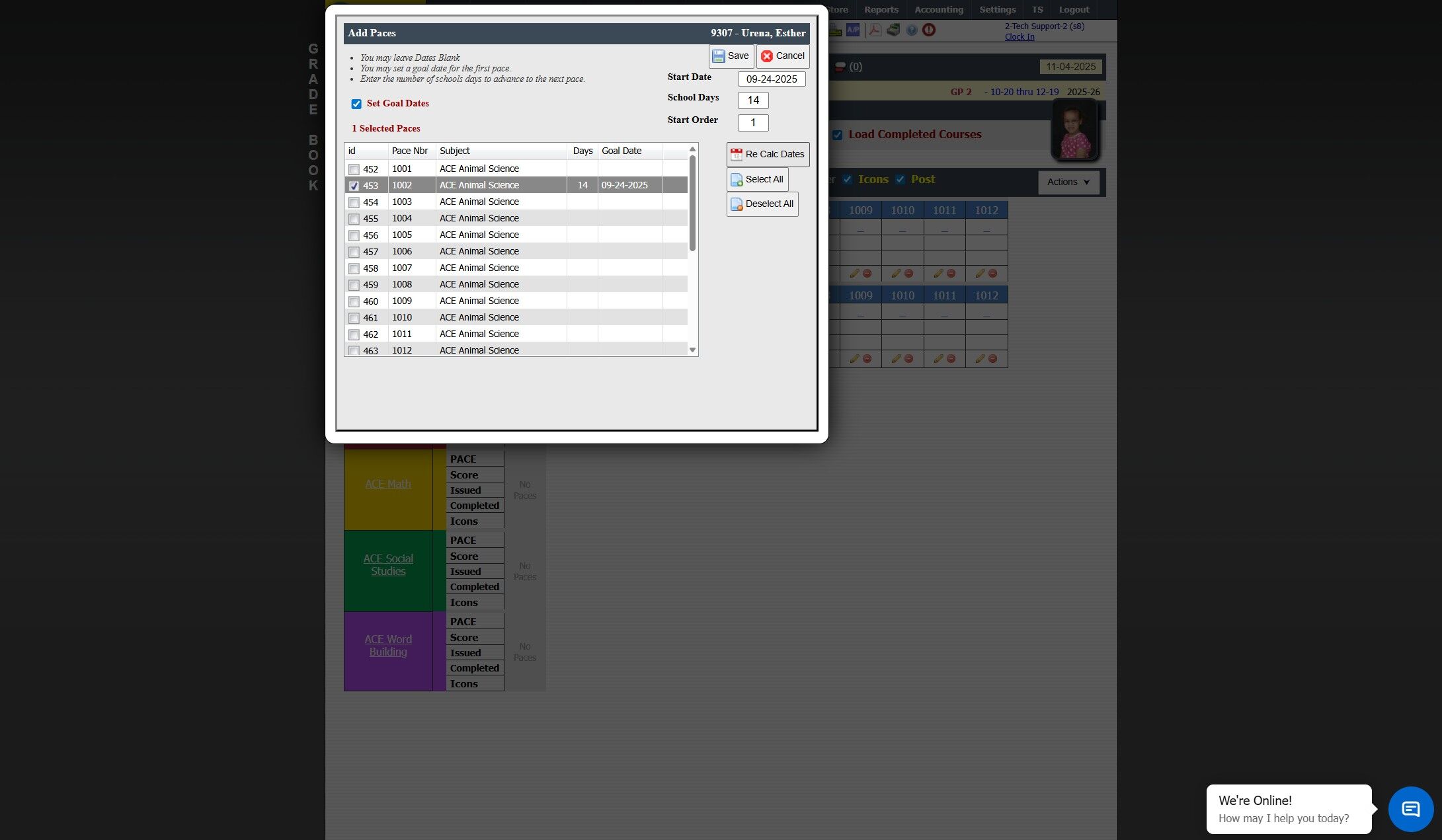 Entering an ACE PACE Grade 1. Click "Teachers" 2. Click "Classroom" 3. Select Learning Center Course in Grid 4. Click "Grade Book" 5. Select Student 6. Click on the Line "-" Under the Issued PACE Number to Enter Grade 7. Enter "Points" (Numeric ...