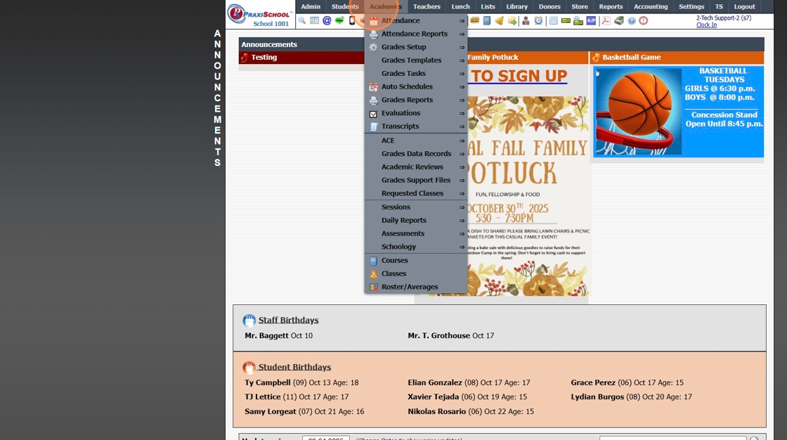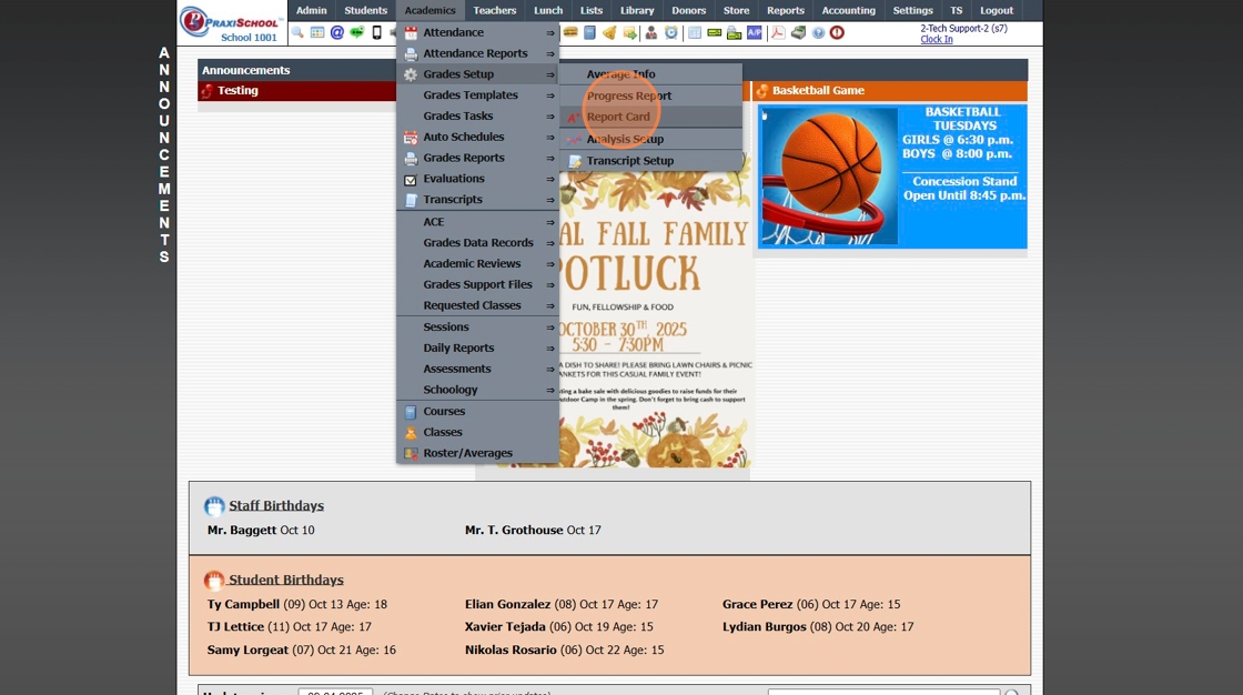 Creating Report Cards 1. Log into PraxiSchool 2. Click "Academics" 3. Click "Grades Reports" 4. Click "Print Report Cards" 5. Select Grade Levels 6. Select Report Card Template 7. Click "Create Report Cards" 2000.6.7