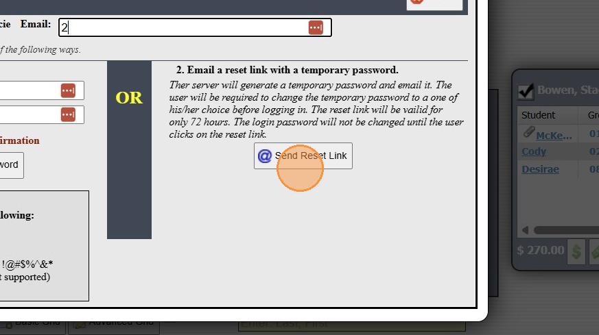 Sending a Password Reset Link - Student 1. Click "Students" 2. Click "Students" 3. Select Student 4. Click "Actions" 5. Click "Reset Password" 6. Click "Send Reset Link" 7000.6.2
