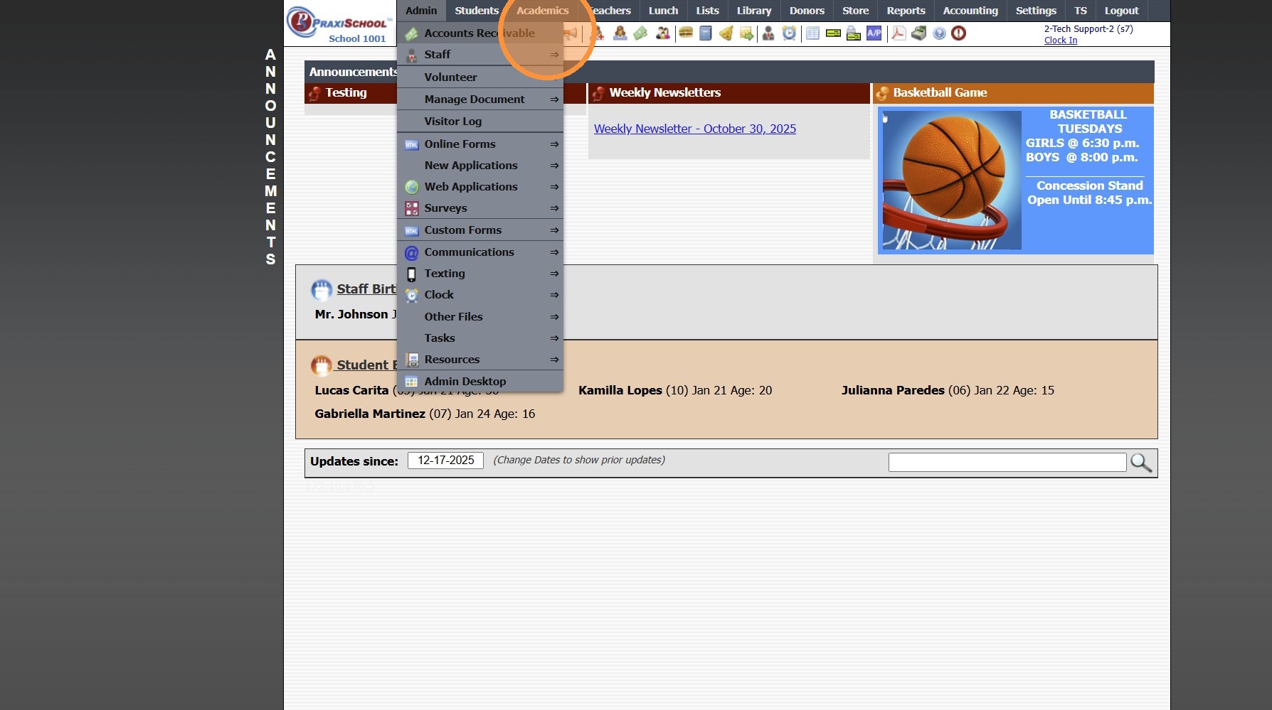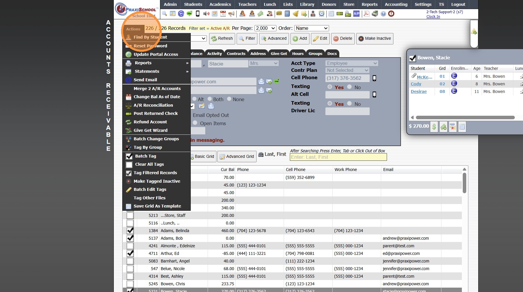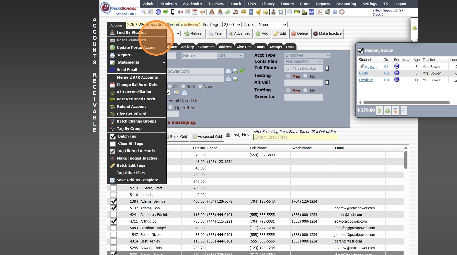 Sending a Password Reset to an Accounts Receivable 1. Log into PraxiSchool 2. Click "Admin" 3. Click "Accounts Receivable" 4. Select the Account 5. Click "Actions" 6. Click "Reset Password" 7. Click "Send Reset Link" 1000.1.20