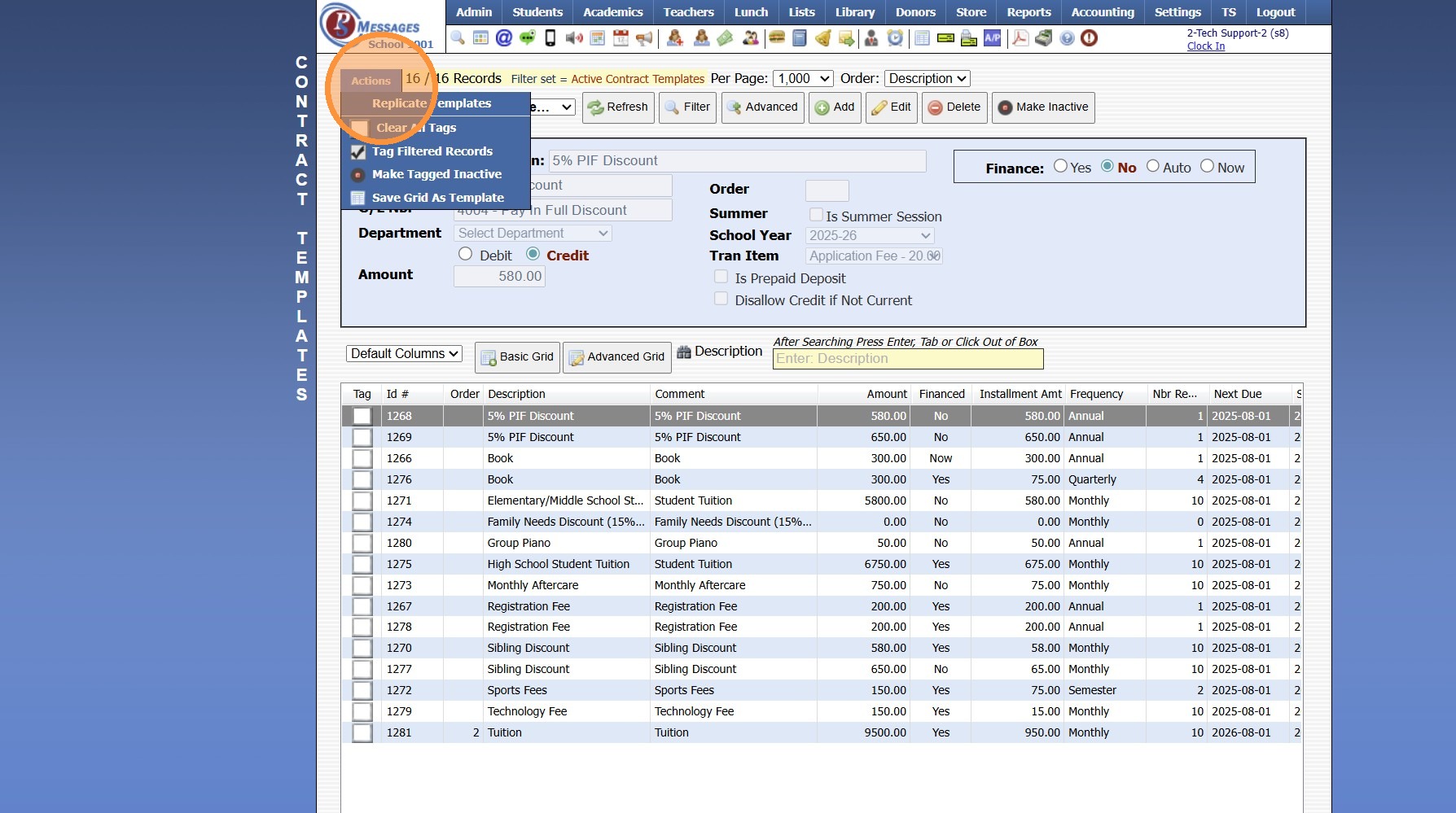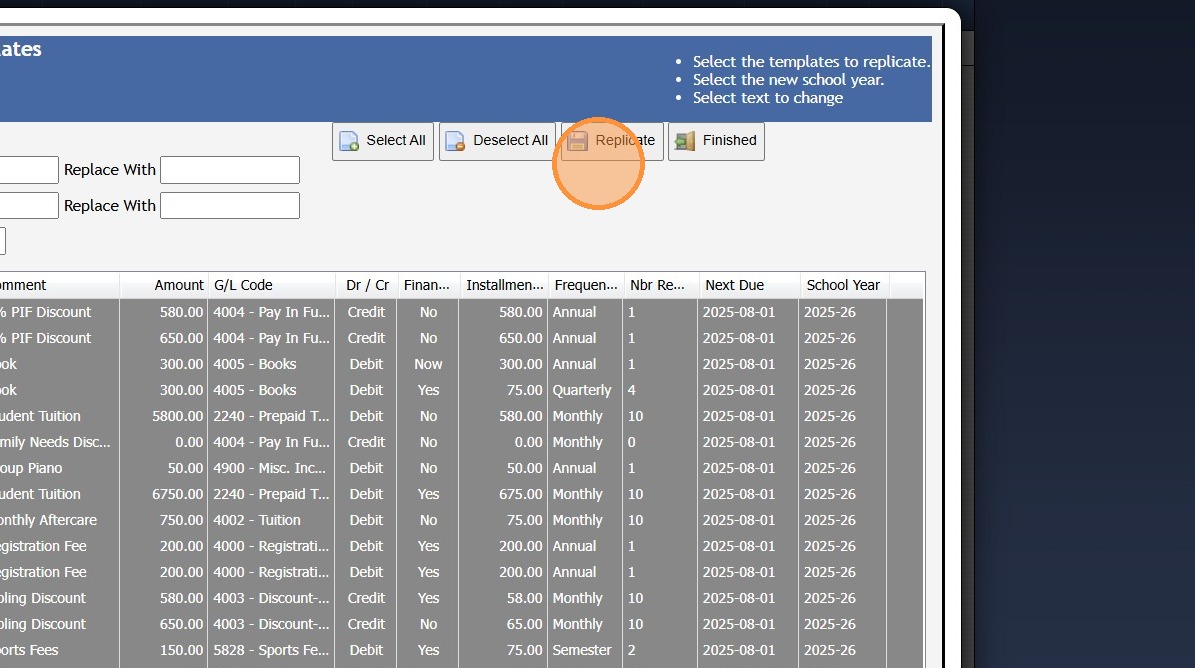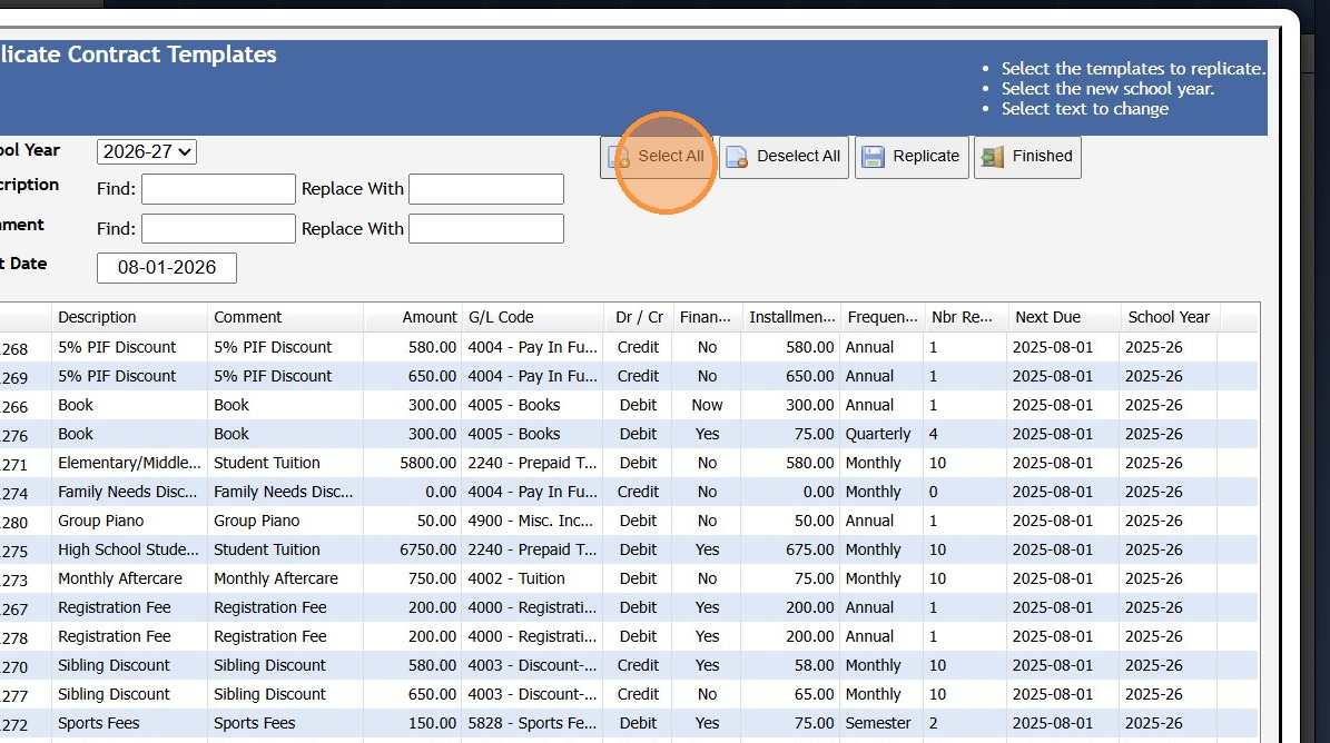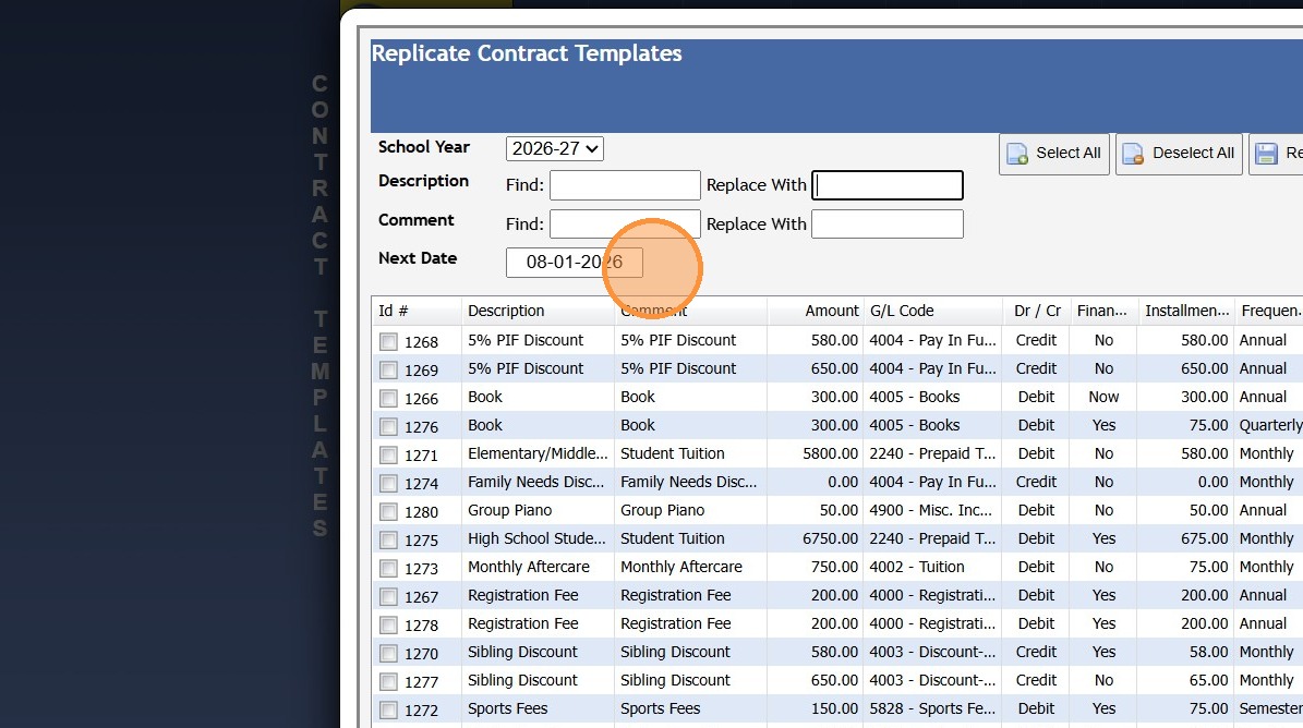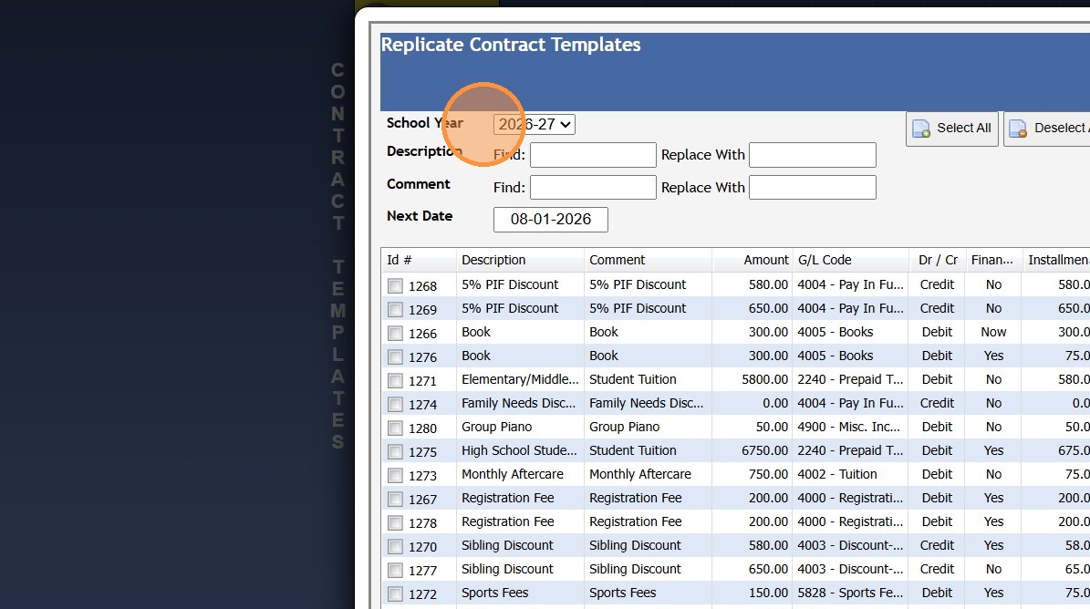 1. Click "Lists" 2. Click "A/R Accounting" 3. Click "Contract Templates" 4. Click "Actions" 5. Click "Replicate Templates" 6. Select the School Year to Replicate the Contract Template Into 7. Set the Next Date for the Contracts to Start Billing (If a ...