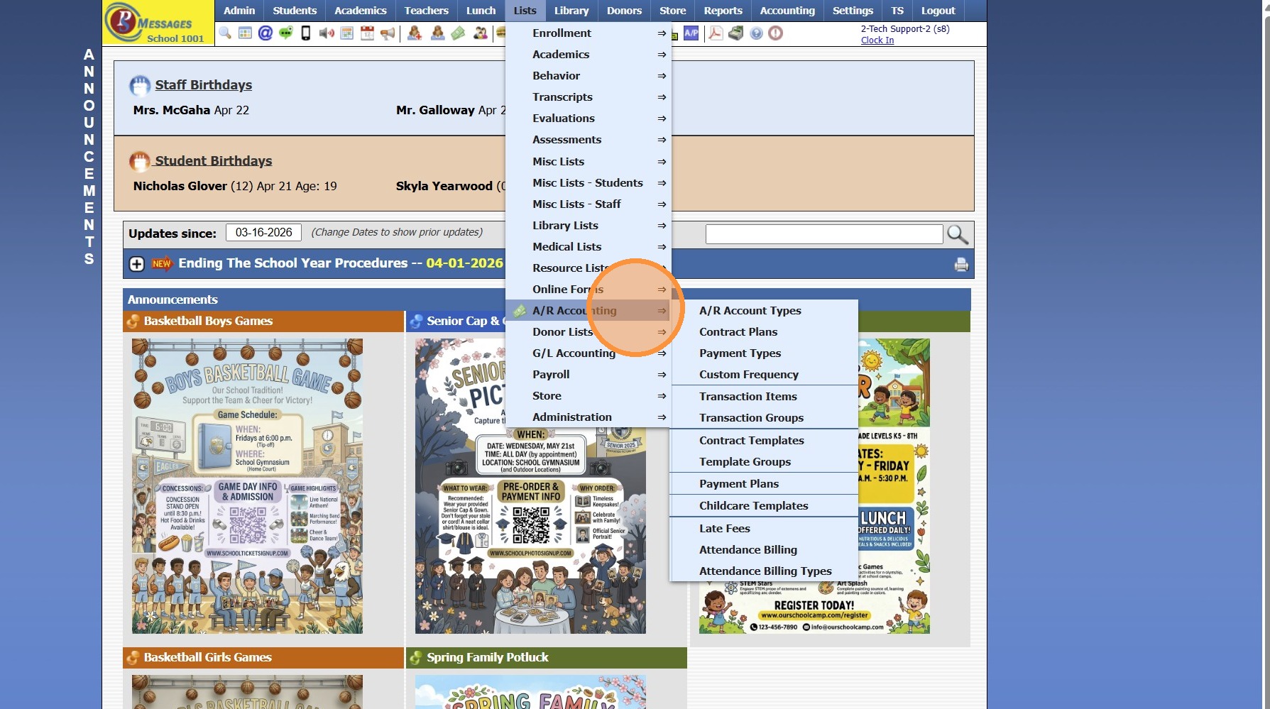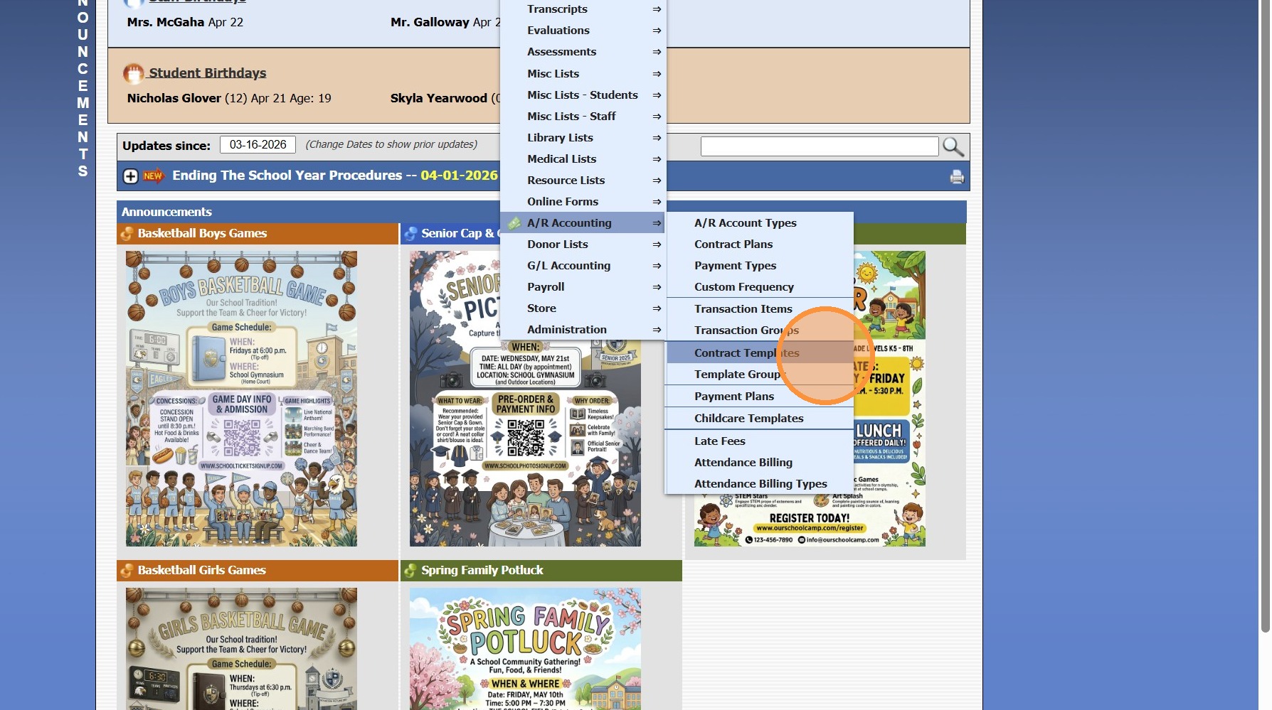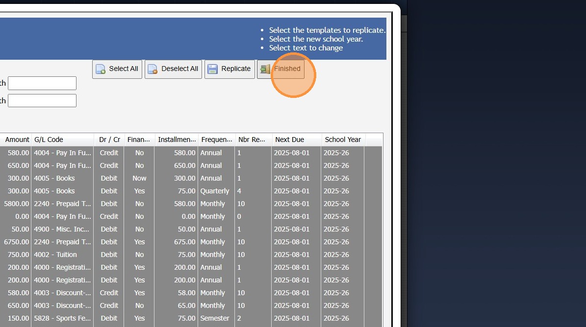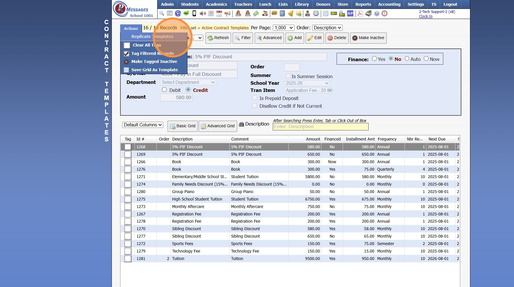 1. Click "Lists" 2. Click "A/R Accounting" 3. Click "Contract Templates" 4. Click "Actions" 5. Click "Replicate Templates" 6. Select the School Year to Replicate the Contract Template Into 7. Set the Next Date for the Contracts to Start Billing (If a ...