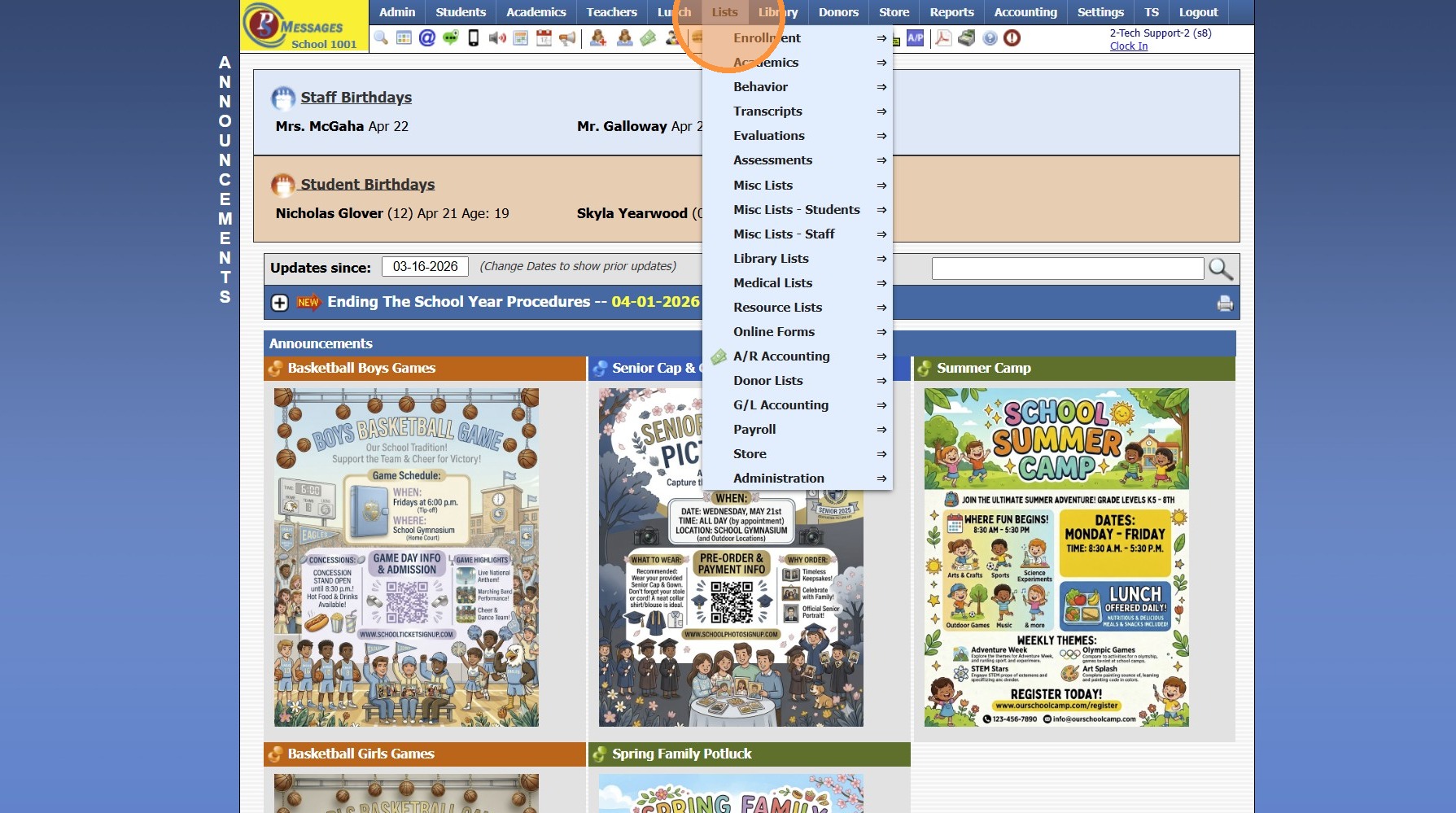 1. Click "Lists" 2. Click "Enrollment" 3. Click "School Years" Add the School Year 4. Click "Add" 5. Enter New School Year (Enter in YYYY-YY Format) (Ex. 2027-28) 6. Enter the Administrator's Name 7. Enter the Date From & the Date To (NOTE: The Date ...