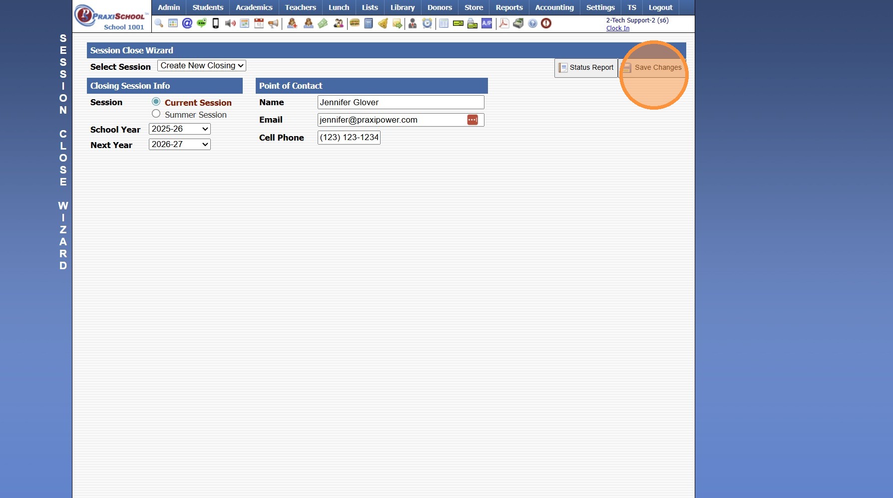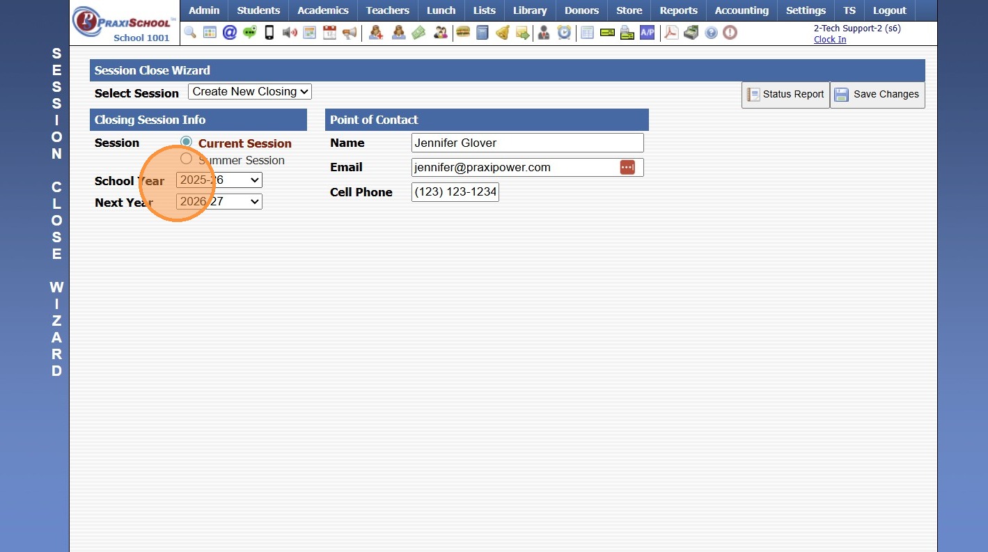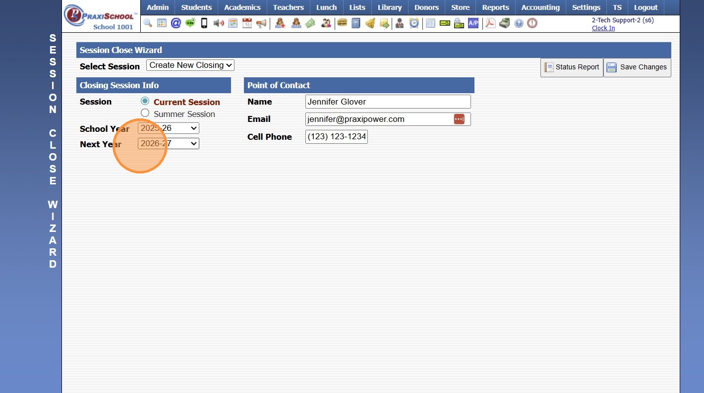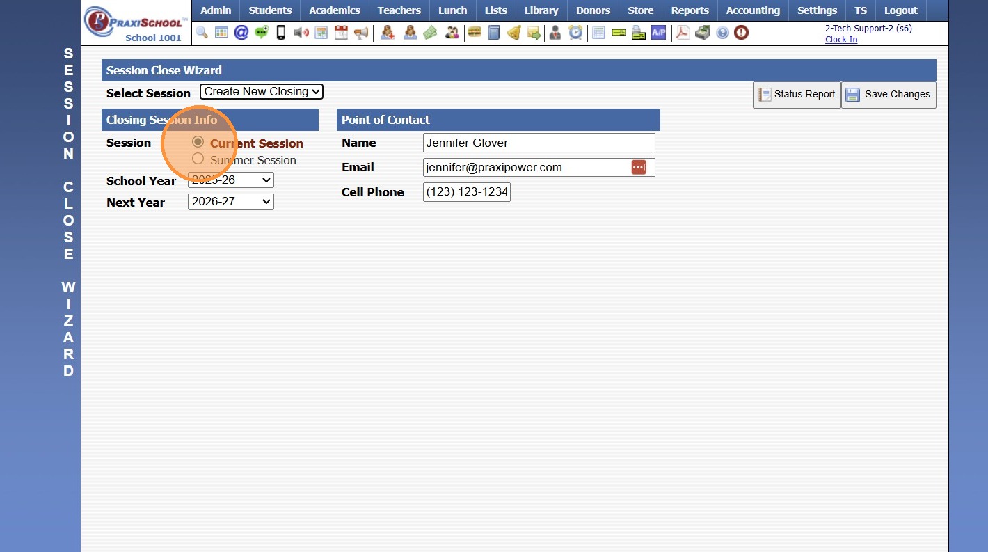 5. Select "Current Session" to Close Current School Year, Select "Summer Session" to Close a Summer Session
